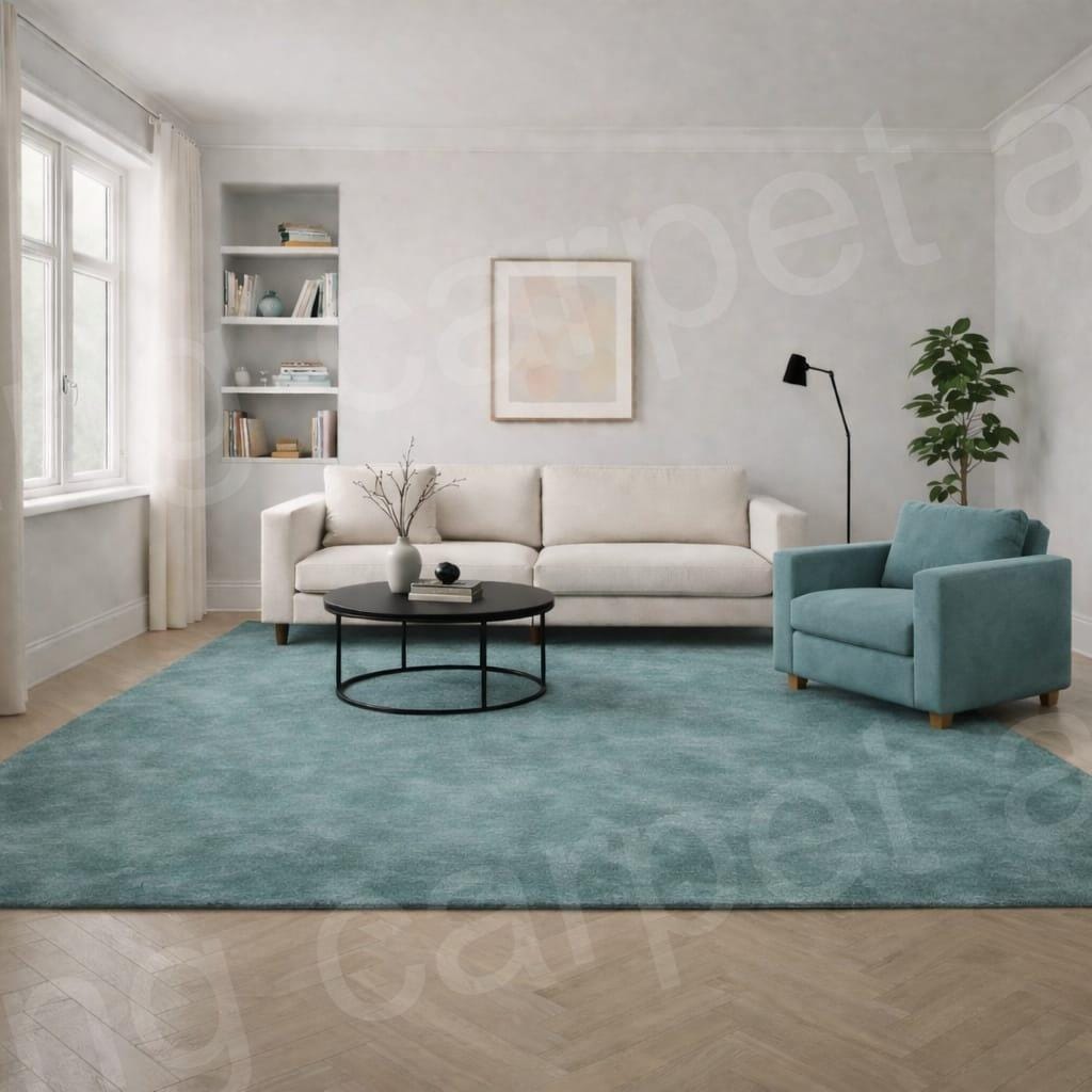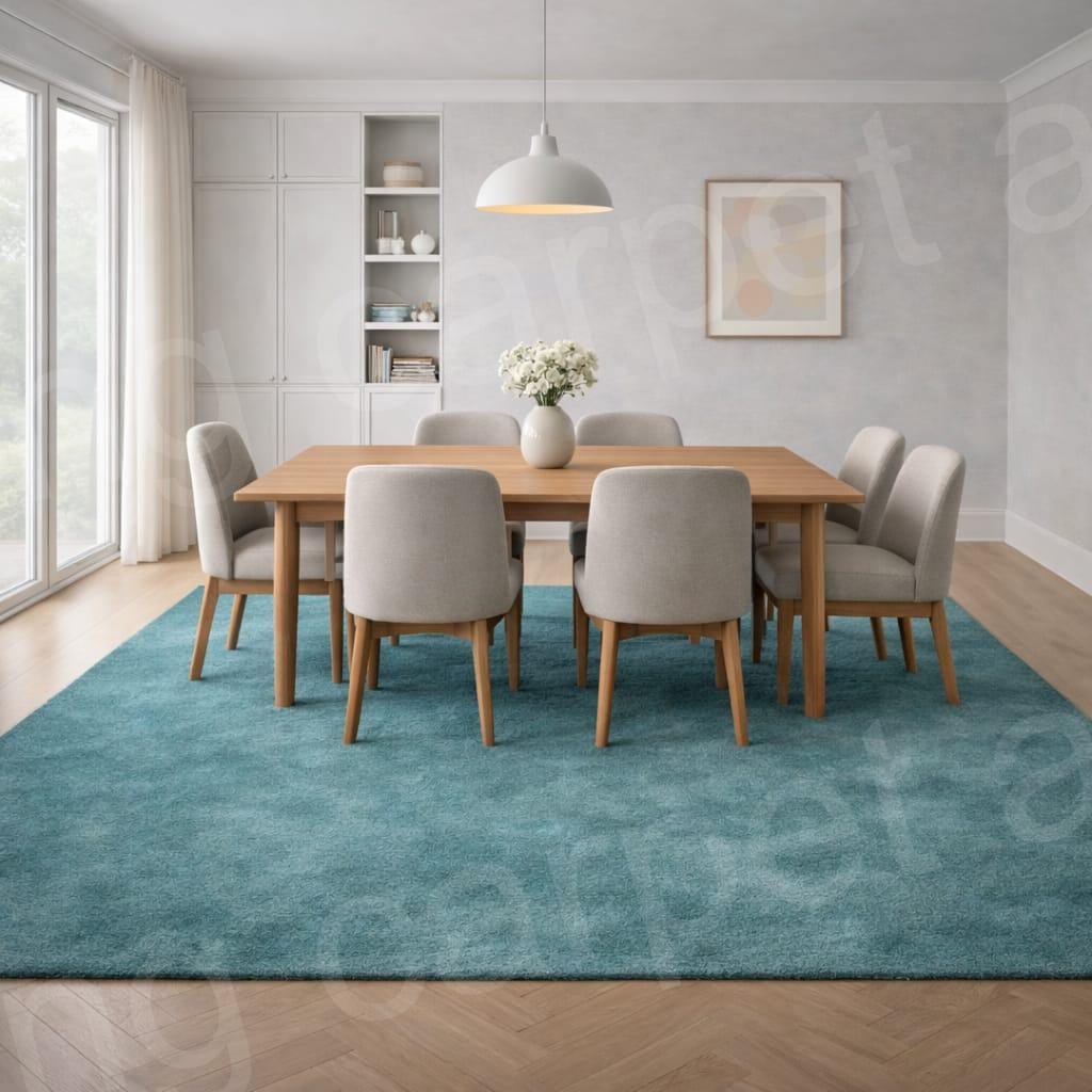The solid teal shade complements neutral furniture and light wood floors, creating a balanced and soothing atmosphere. Whether you’re styling a modern apartment or upgrading your home décor, this rug offers both comfort and timeless style.