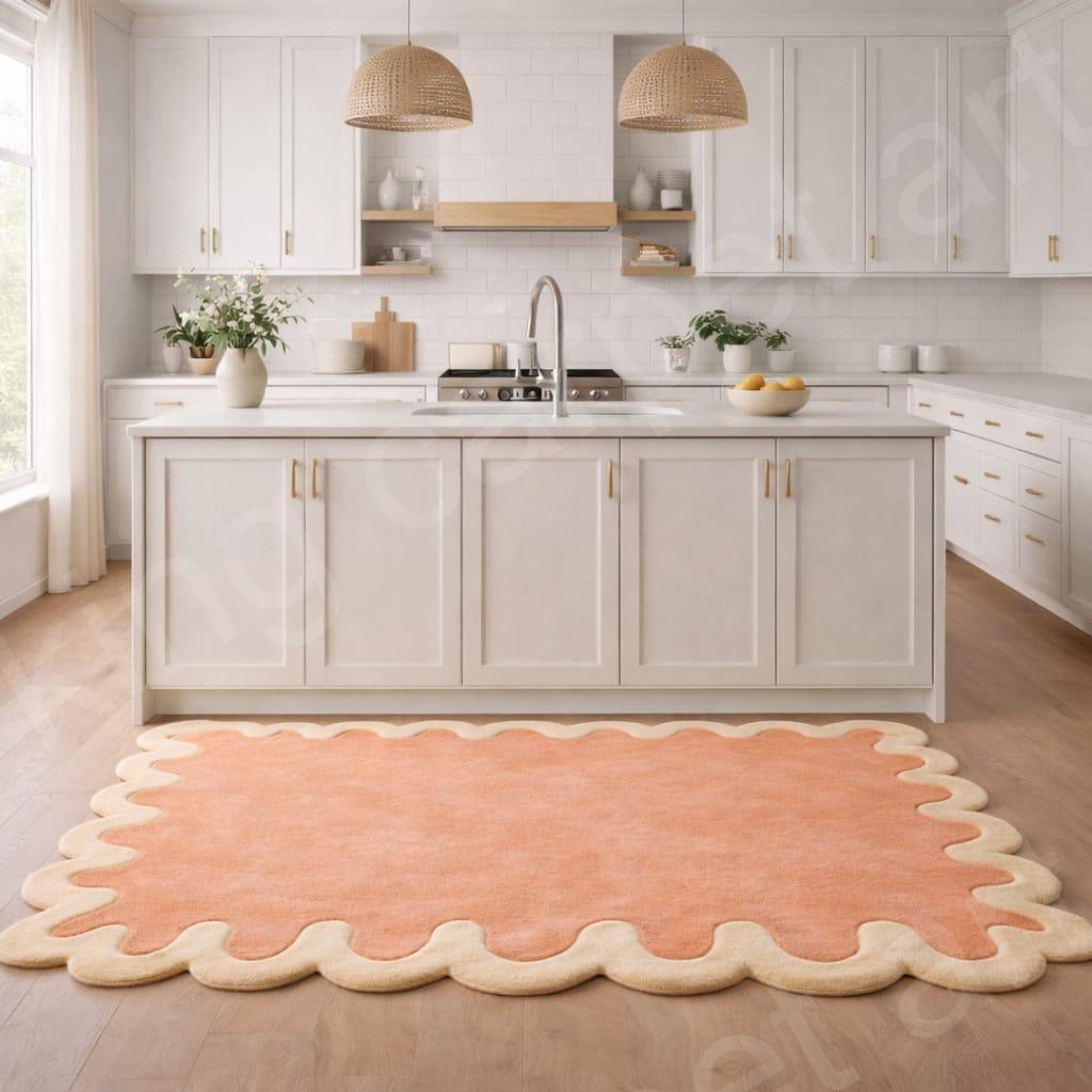 This pastel scalloped statement rug is perfect for anyone looking to add a unique and stylish decorative element to their home. Its soft color, irregular shape, and modern design create a warm and visually appealing space that feels both comfortable and beautifully curated.