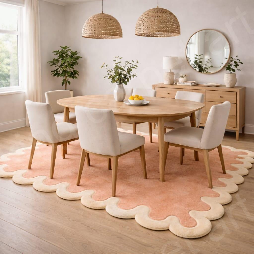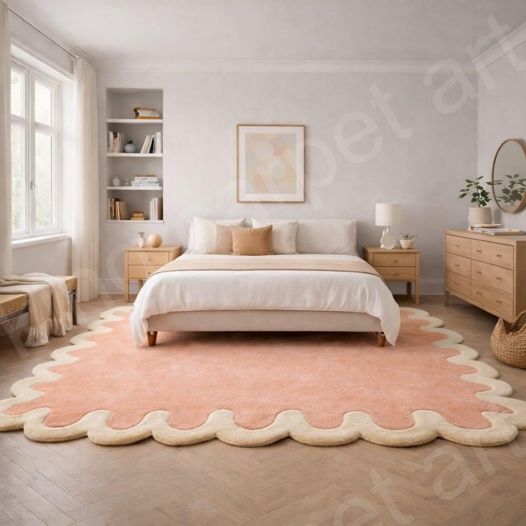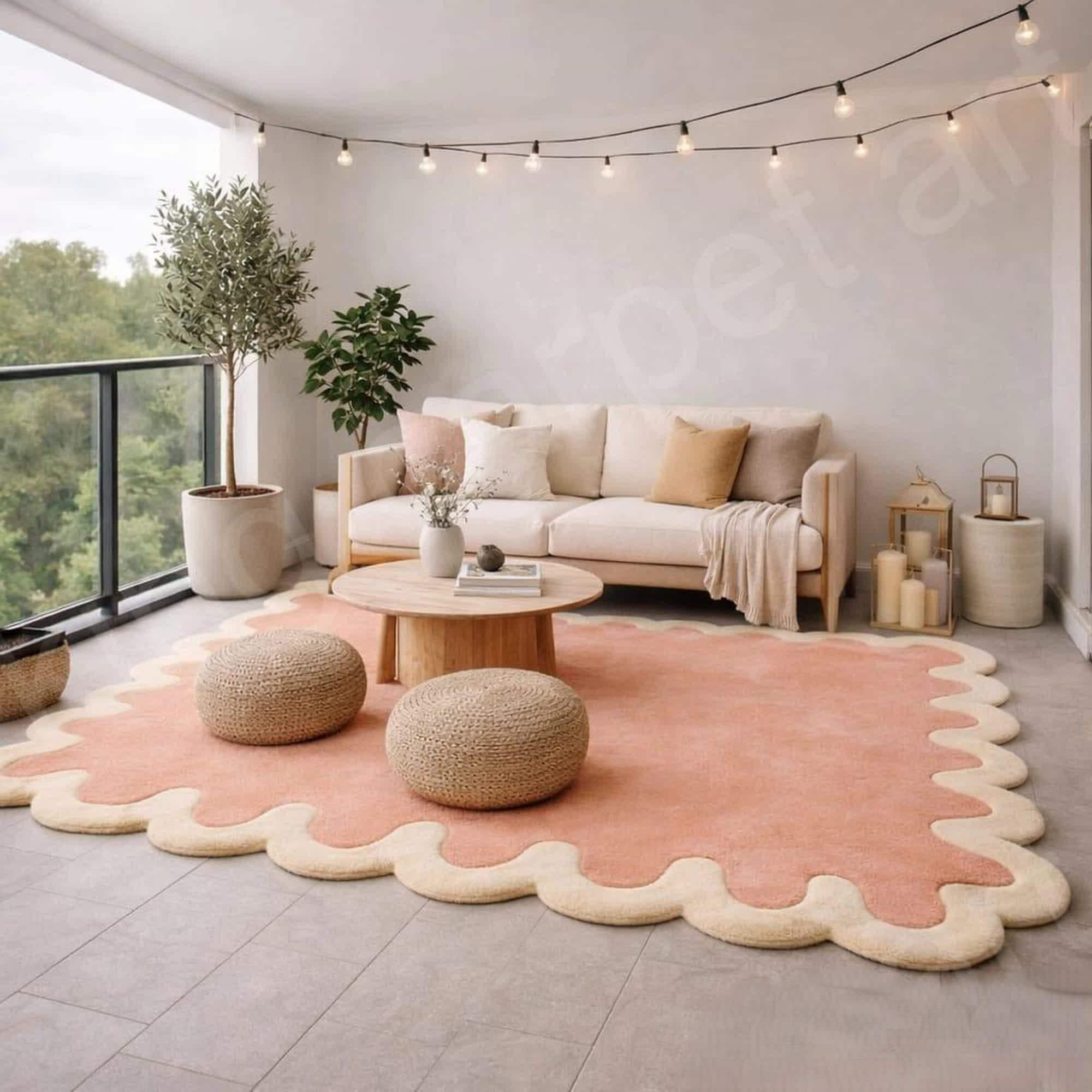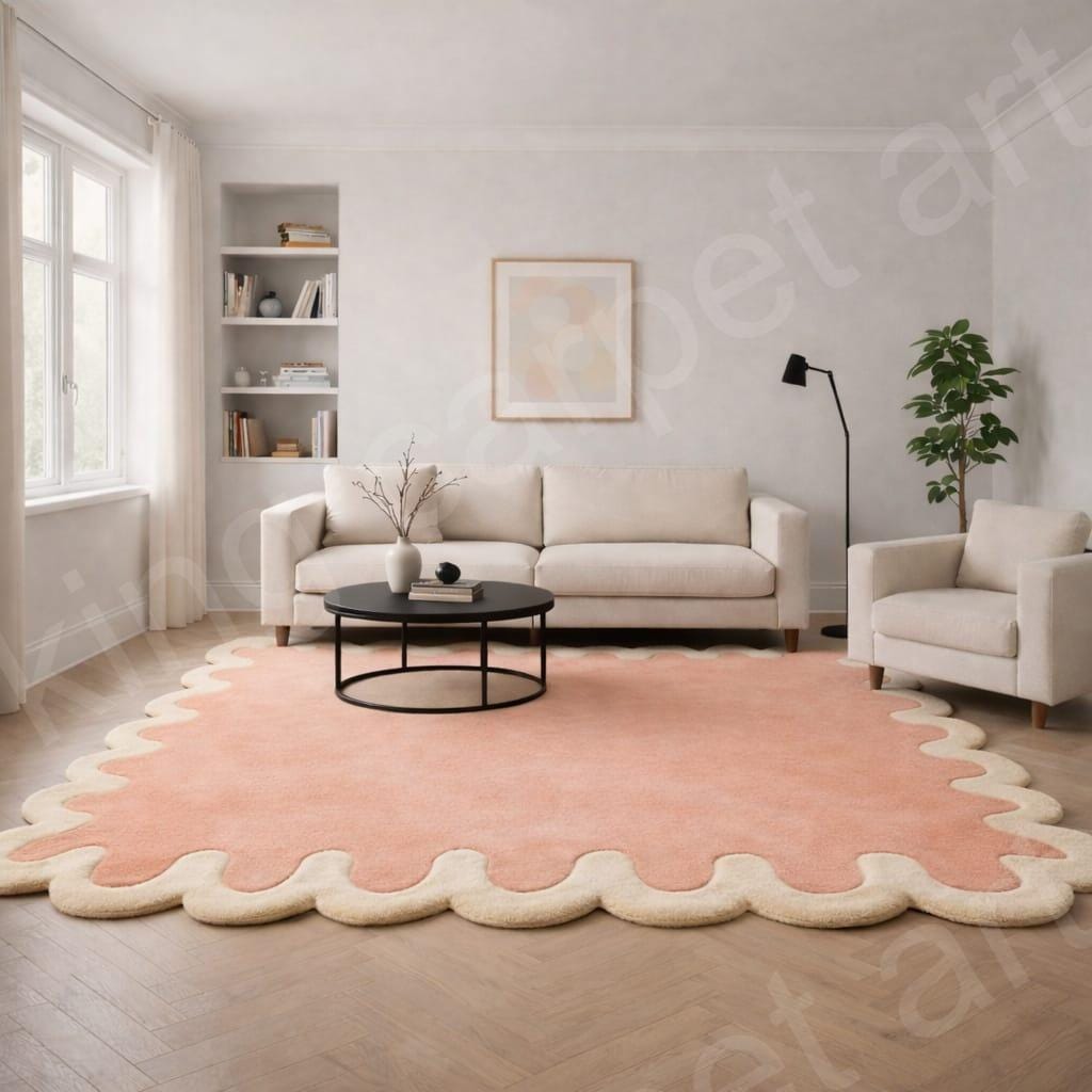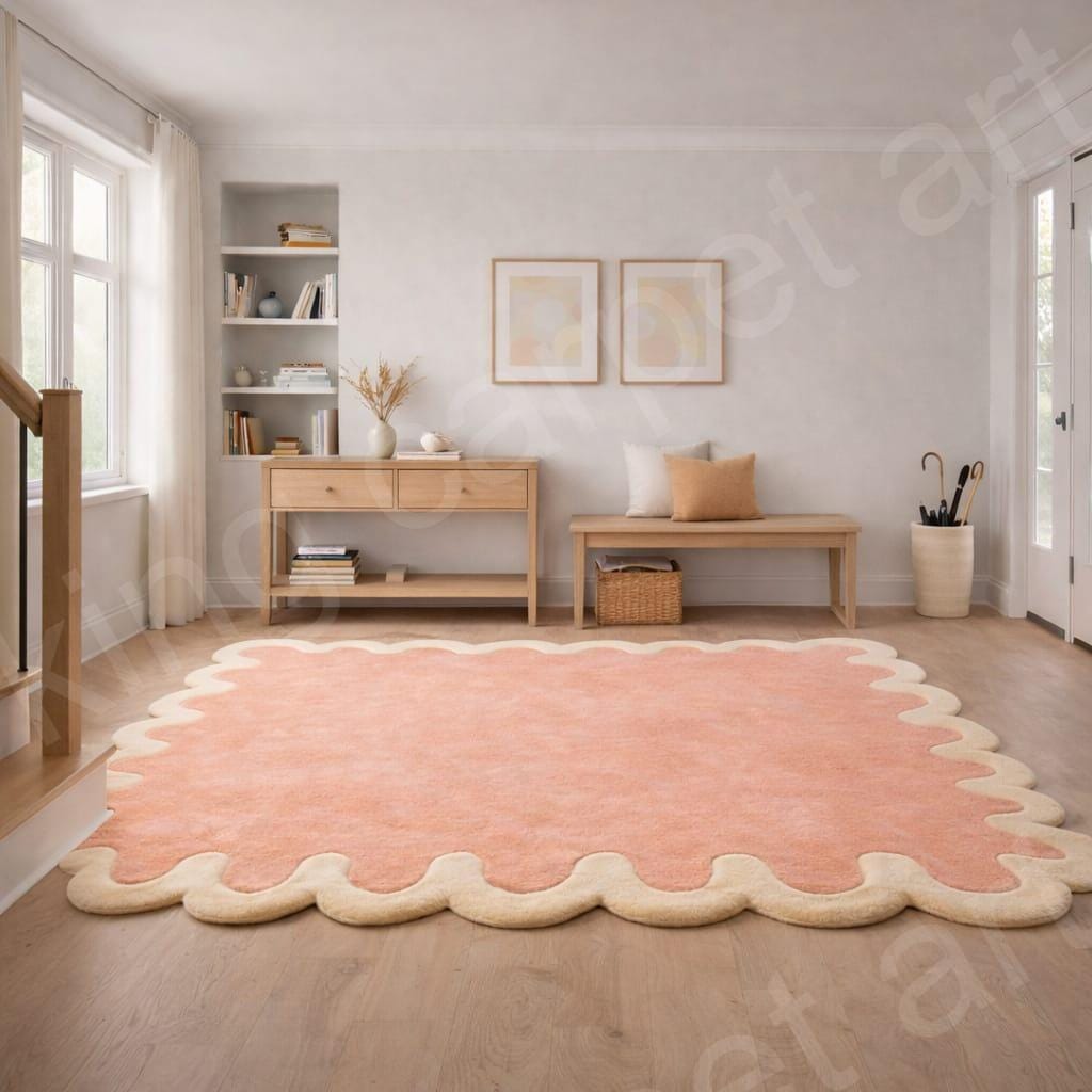 Add a soft and elegant touch to your home with this Pink Scalloped Rug, a beautiful pastel scalloped edge area rug designed to bring warmth, comfort, and modern style to any space. Featuring a unique irregular scalloped shape, this handmade tufted rug creates a charming and eye-catching statement that enhances contemporary and aesthetic interiors.