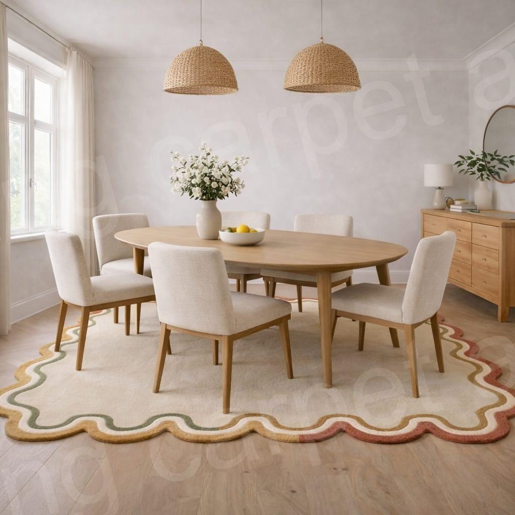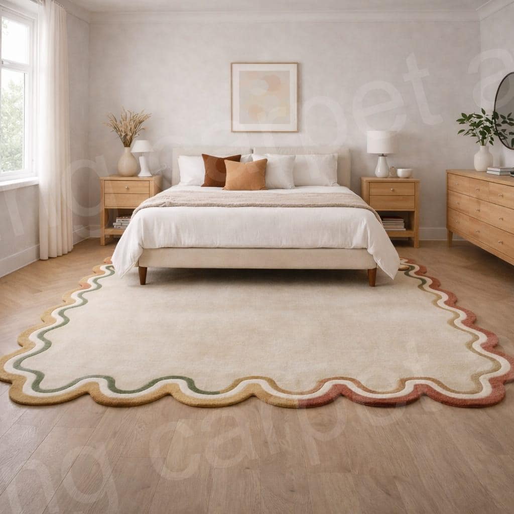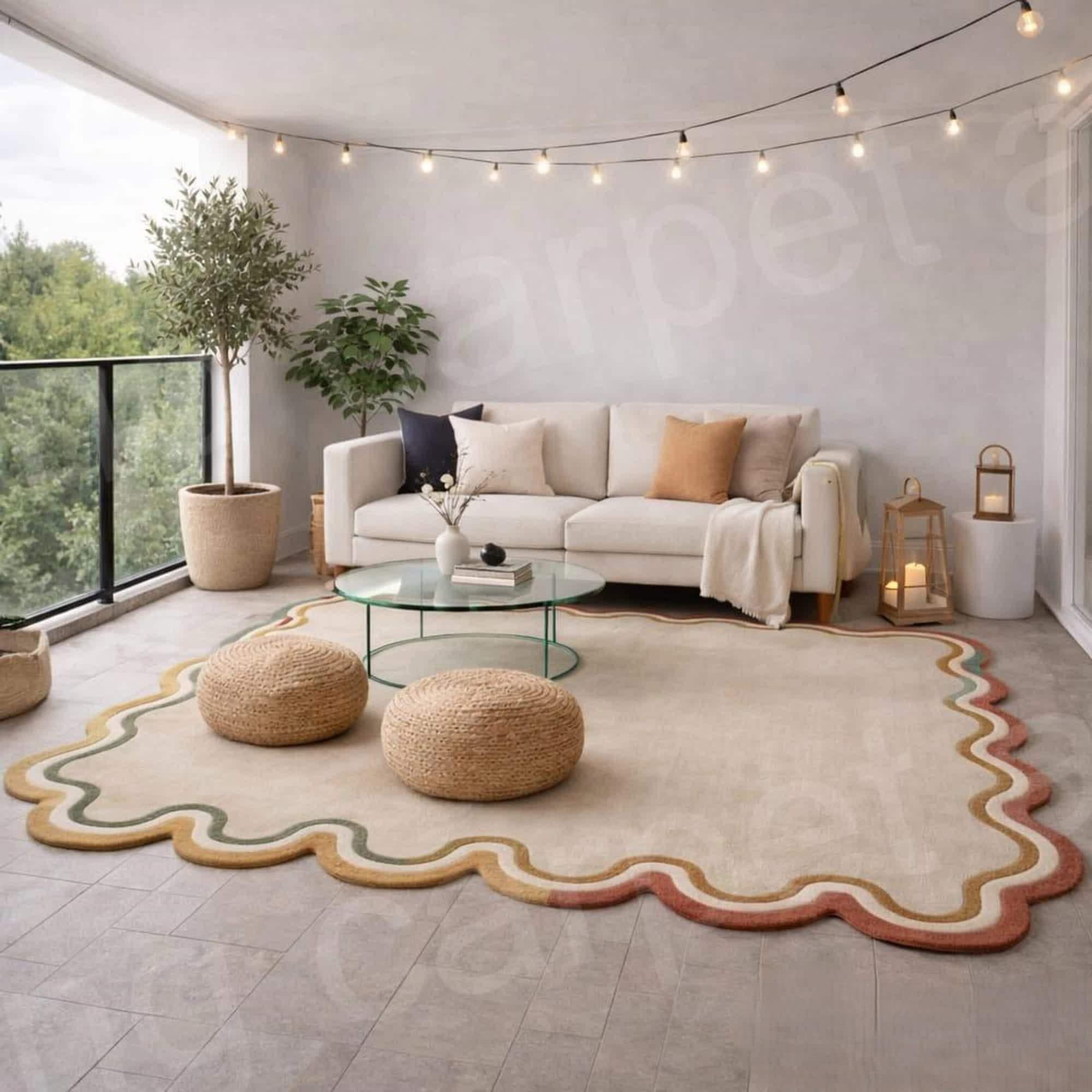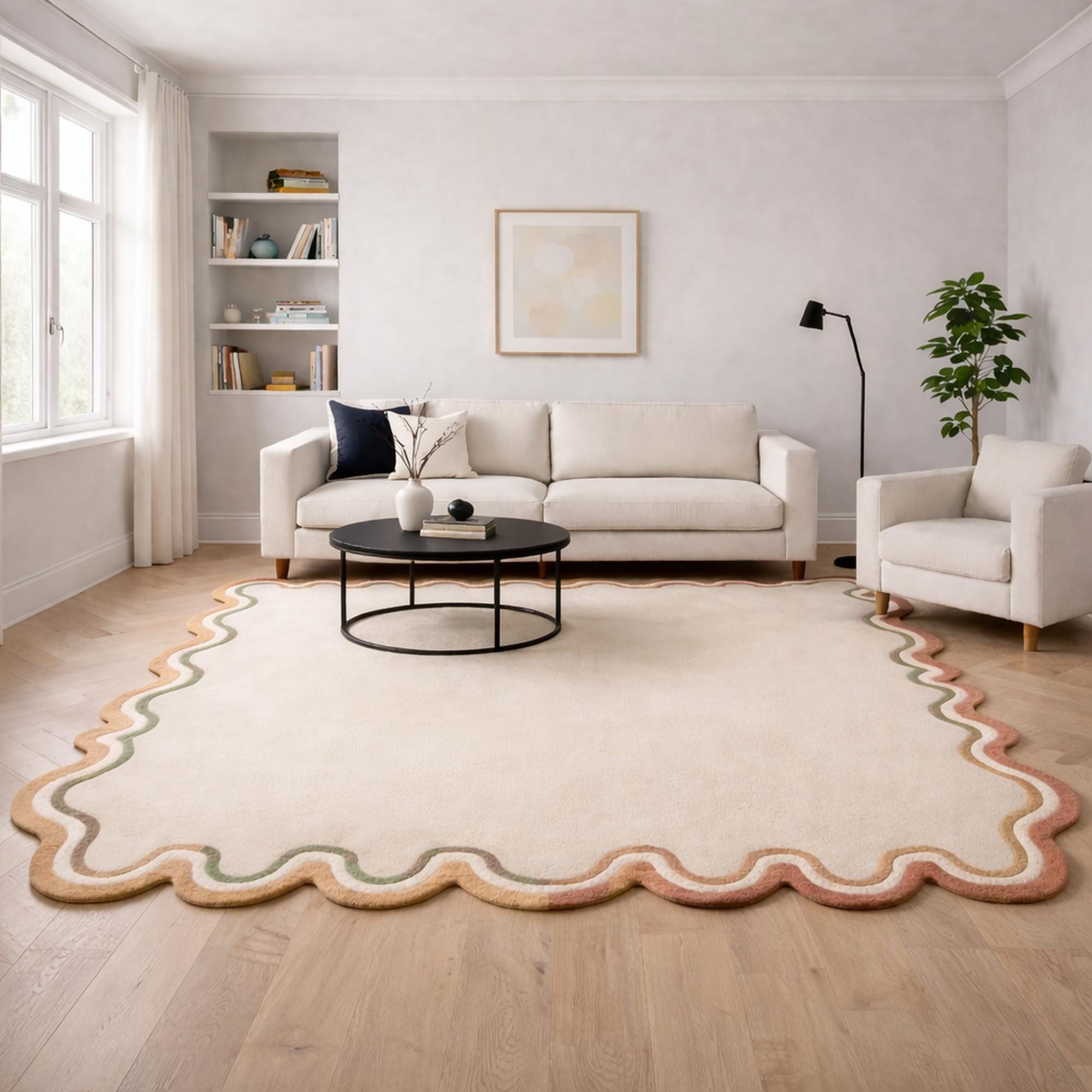 Perfect for living rooms, bedrooms, reading corners, or cozy apartments, this rug blends effortlessly with minimalist, Scandinavian, and contemporary interiors. The scalloped edges create a unique statement piece that feels both stylish and timeless.