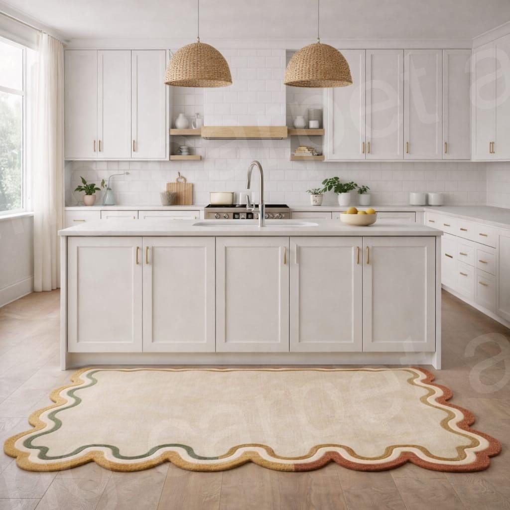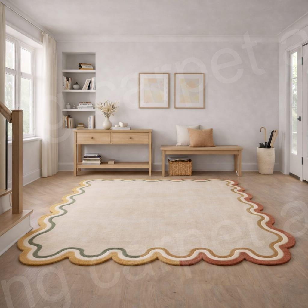 Bring soft elegance into your home with this beautifully crafted handmade scalloped edge rug. Designed with a calm neutral beige base and a flowing wavy border in earthy tones, this rug adds a subtle artistic touch while maintaining a clean, modern look.