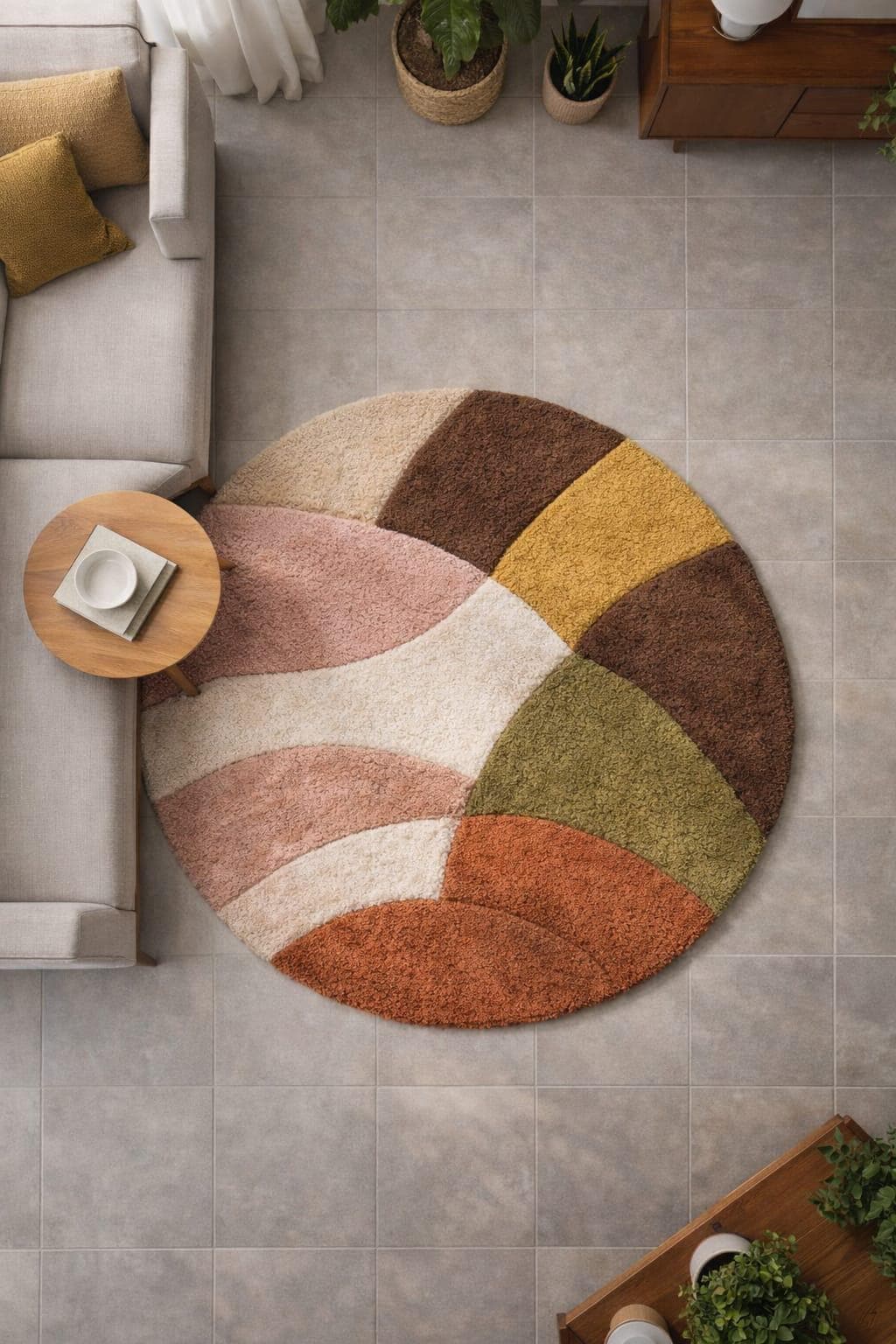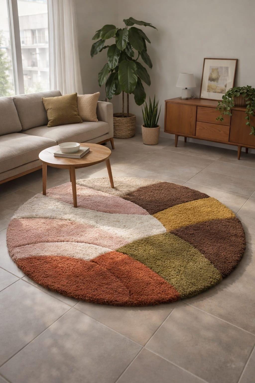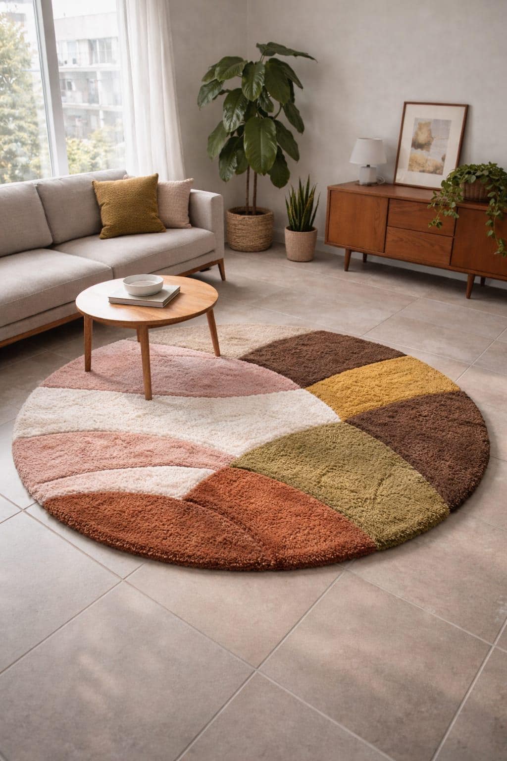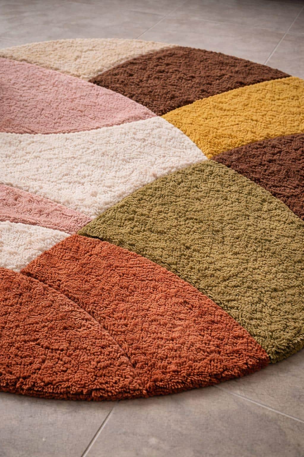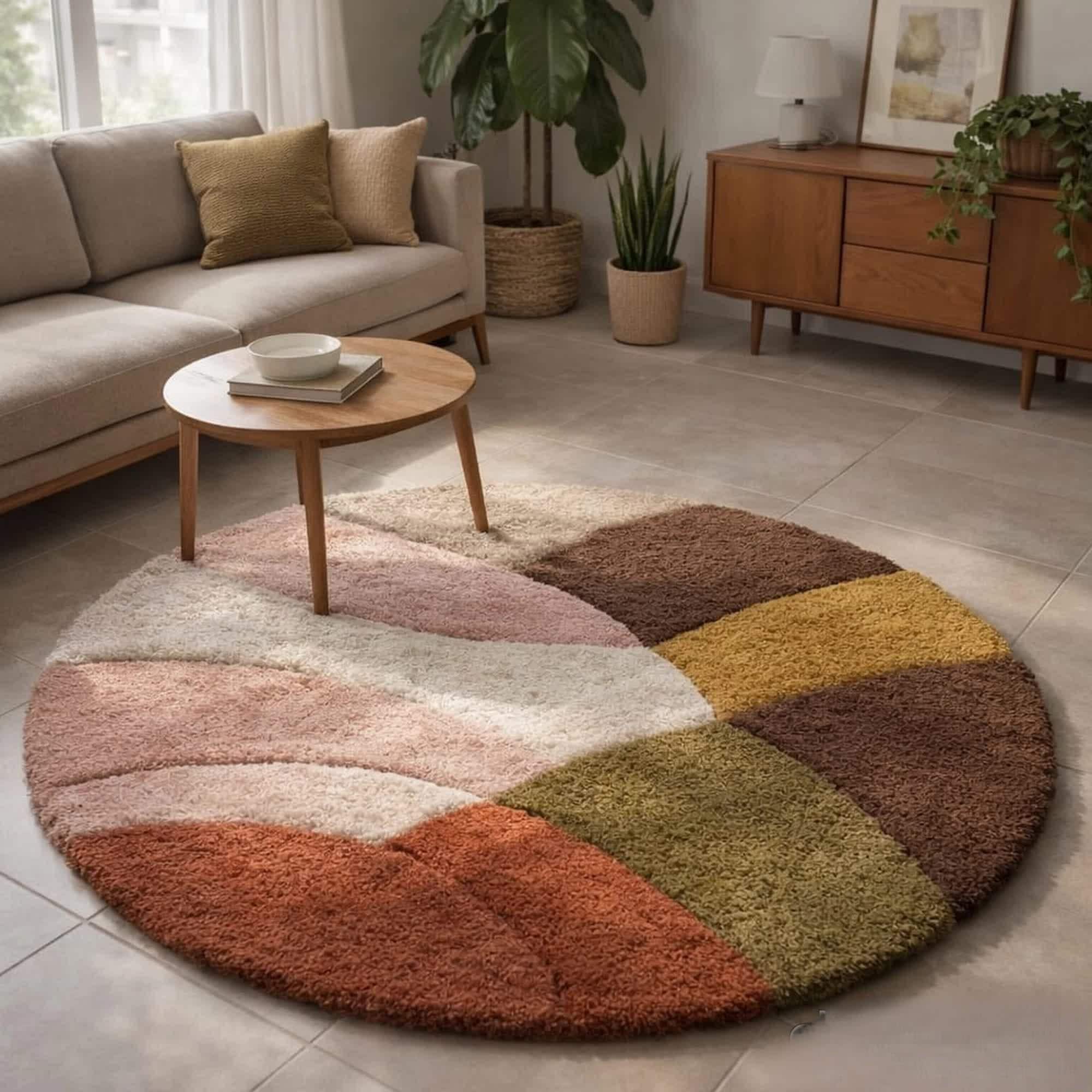 Featuring a modern geometric color-block design, this rug blends earthy tones with soft pastels, making it an ideal statement piece for living rooms, bedrooms, reading corners, nurseries, or cozy lounges. Its round shape softens sharp interiors and adds visual balance, especially in minimalist, Scandinavian, mid-century modern, or boho-inspired homes.
