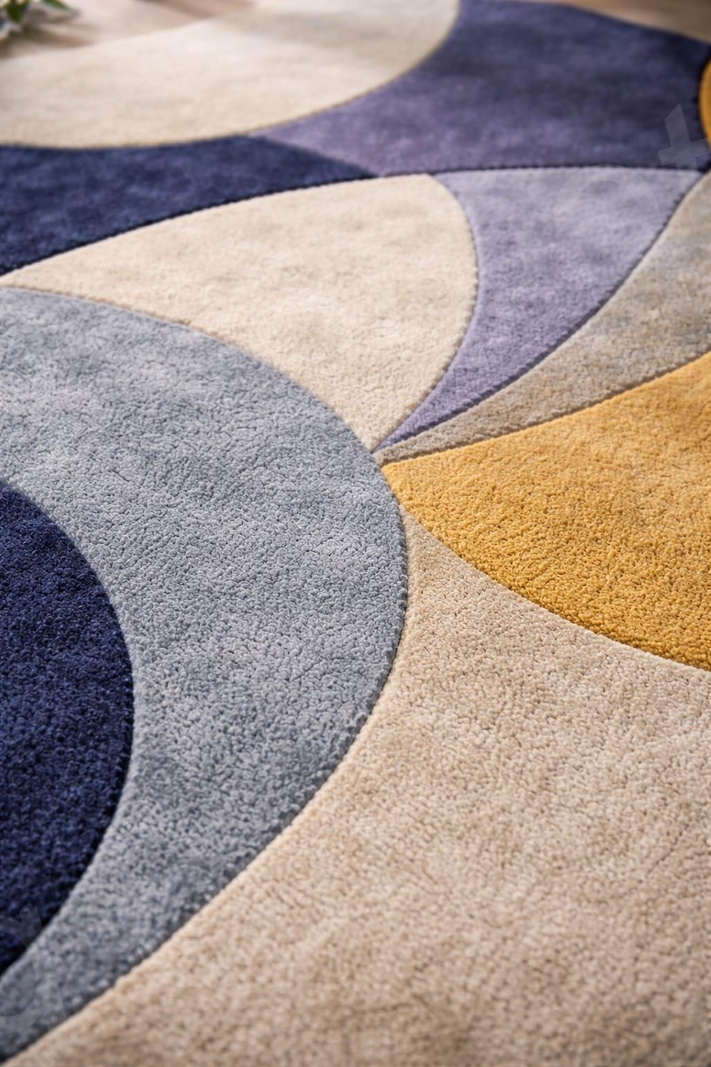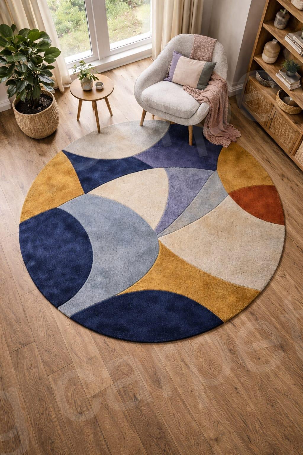 Add a modern and artistic touch to your home with this beautiful Abstract Round Area Rug. Designed with elegant geometric curves, this rug features a soothing blend of navy blue, beige, mustard yellow, and soft grey tones, making it a perfect statement piece for contemporary interiors.