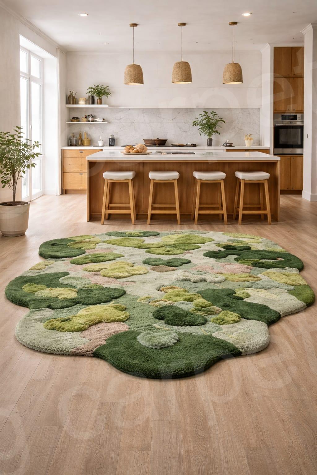 Bring the beauty of nature indoors with this handmade moss-inspired tufted rug. Designed to look like natural forest moss, this rug features soft organic shapes and calming green tones that create a peaceful and refreshing atmosphere in any space.