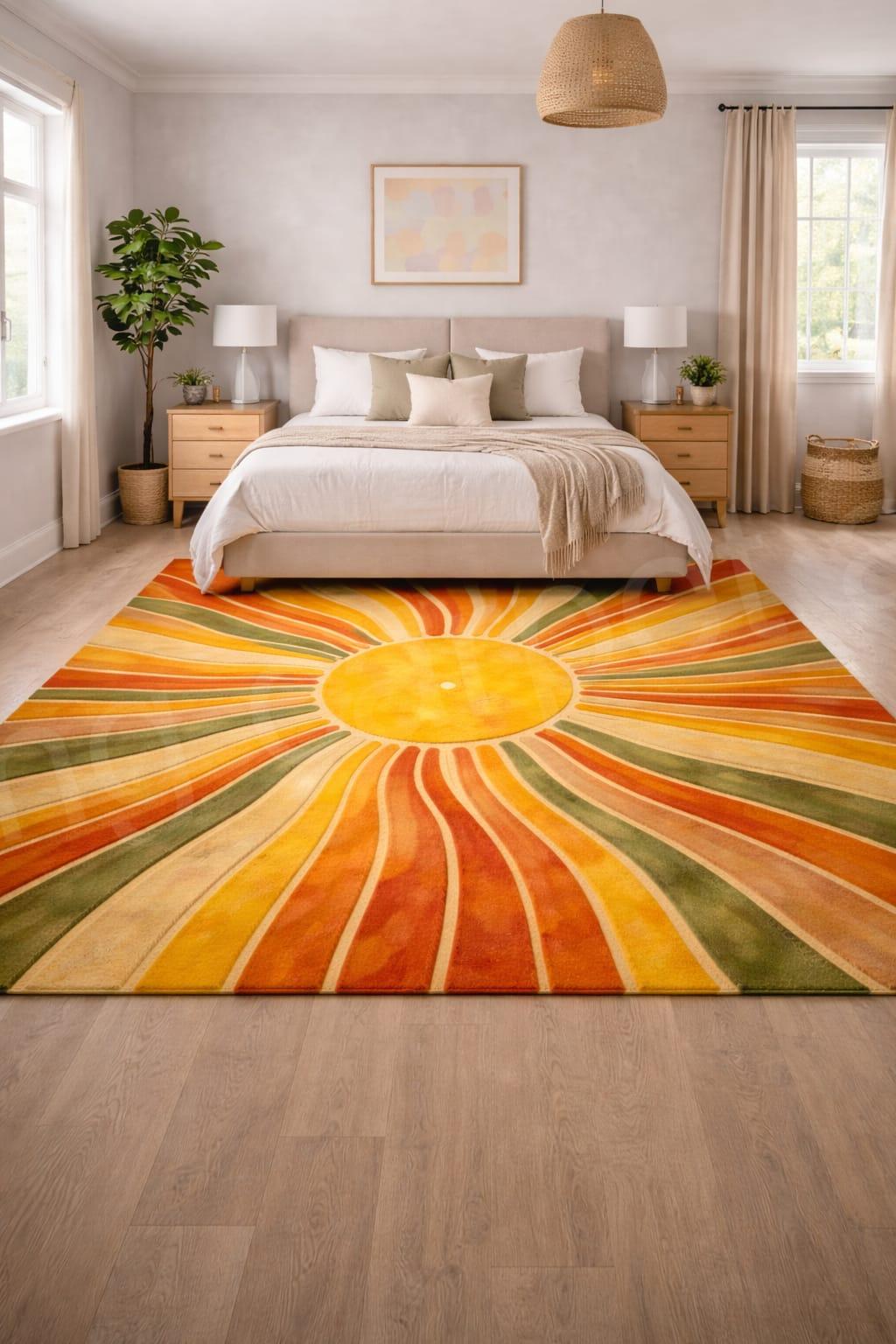 Add warmth, color, and modern artistry to your home with this beautiful handmade tufted sunburst area rug. Inspired by a radiant sunrise pattern, this rug features flowing abstract lines in orange, yellow, green, and ivory tones, making it a perfect statement piece for contemporary and boho interiors. The bright yet balanced colors bring positive energy to any space without feeling too loud.