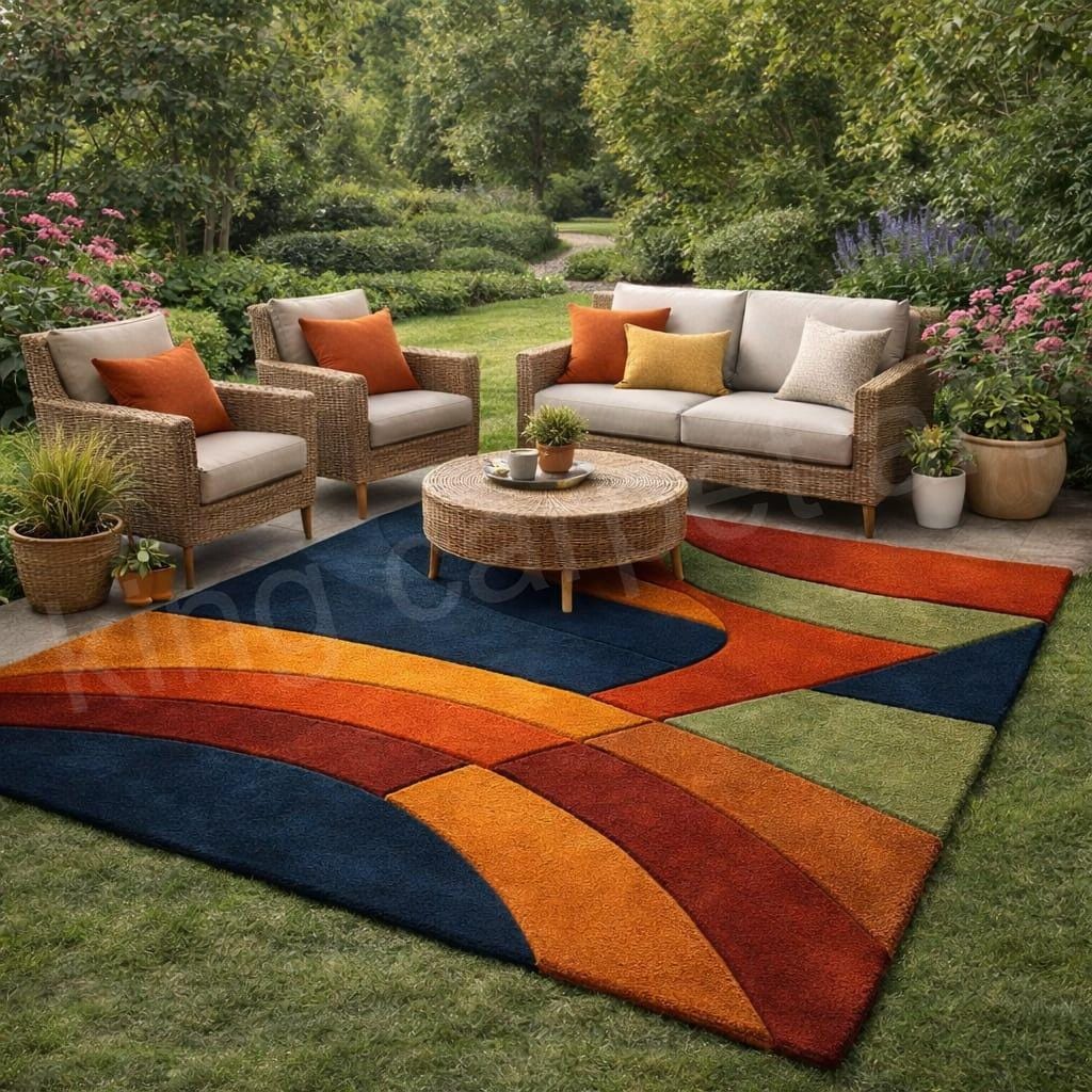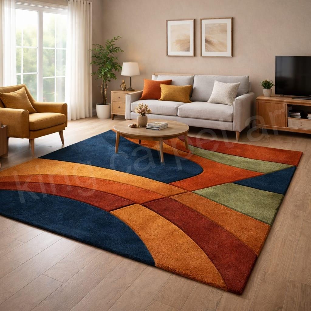 Upgrade your home with this eye-catching modern abstract tufted area rug, designed to bring color, comfort, and contemporary style to any room. Featuring smooth curved patterns in navy blue, rust orange, mustard yellow, olive green, and ivory, this rug adds warmth and personality without overwhelming your space. It’s a perfect statement piece for modern, mid-century, boho, and contemporary interiors.