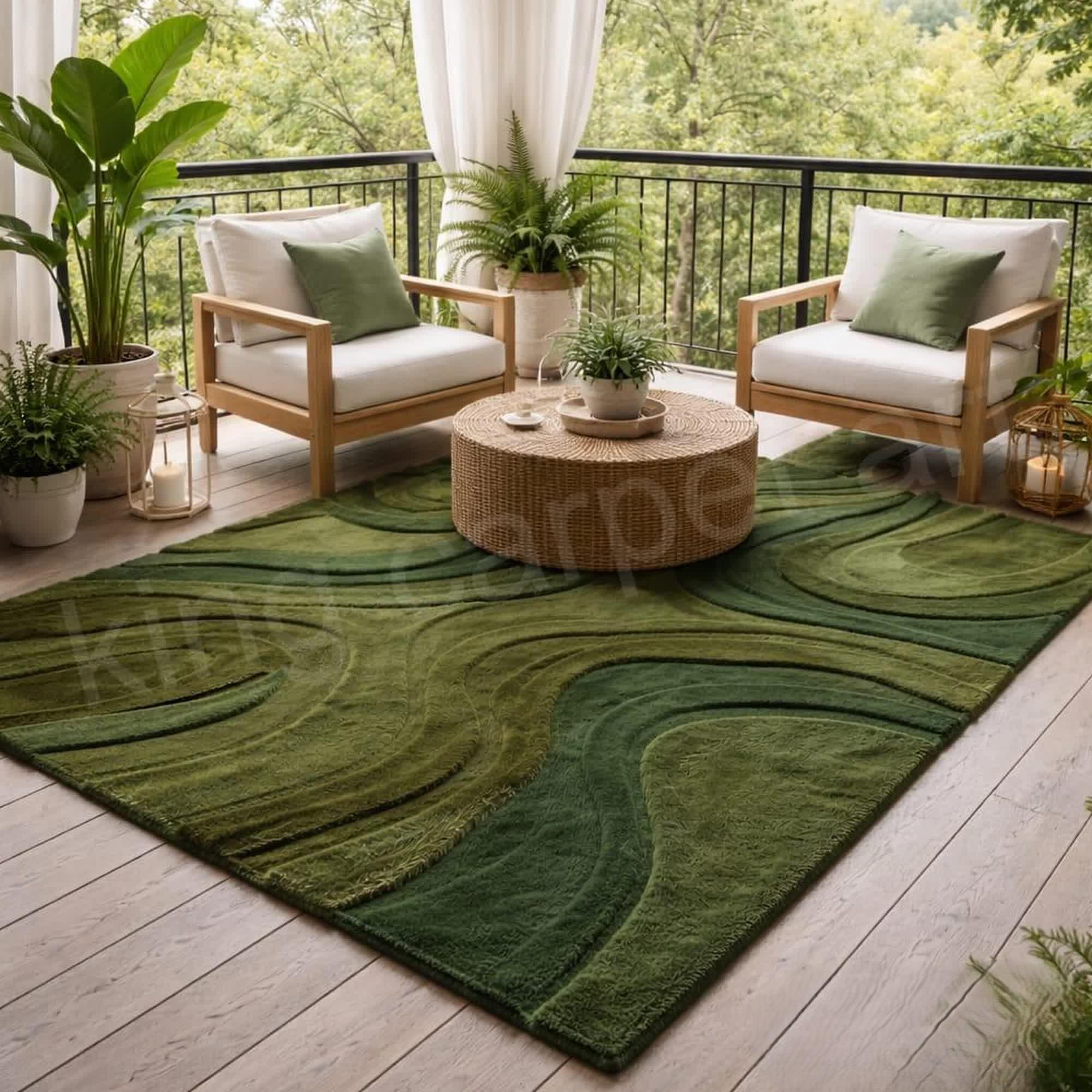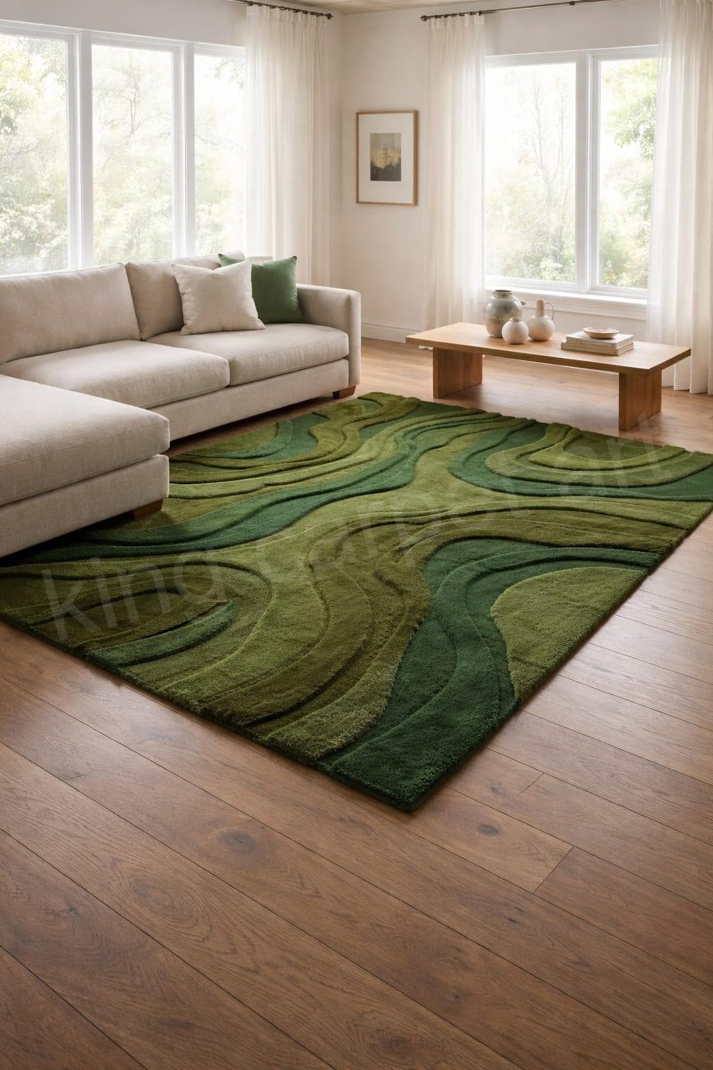 Aesthetic & Style As seen in the modern living room setting, this rug pairs exceptionally well with neutral linen upholstery and natural wood finishes. It acts as a "living" piece of art that anchors a space with a calm, grounding energy. Whether you are aiming for a forest-core aesthetic, a modern minimalist look, or a luxurious boutique hotel vibe, this topographical rug provides an immediate designer upgrade. It is inherently stain-resistant and designed to maintain its beautiful 3D definition even in high-traffic areas.