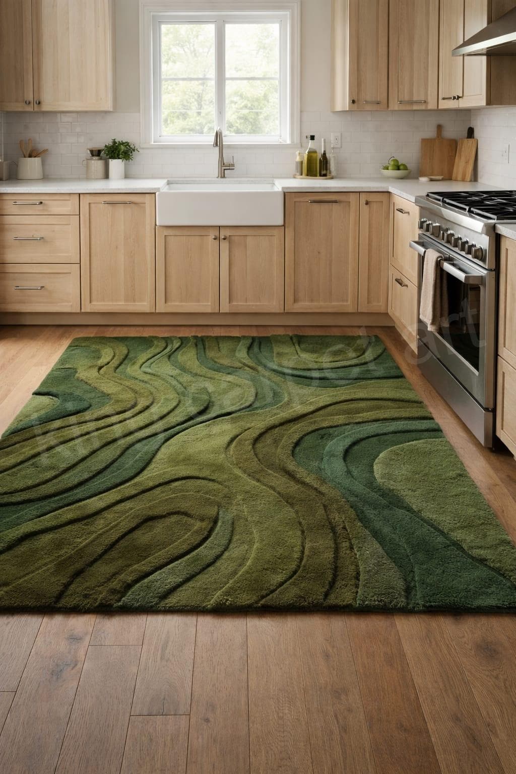 Green Topographical Wave Rug – Hand-Carved Textured Abstract Carpet