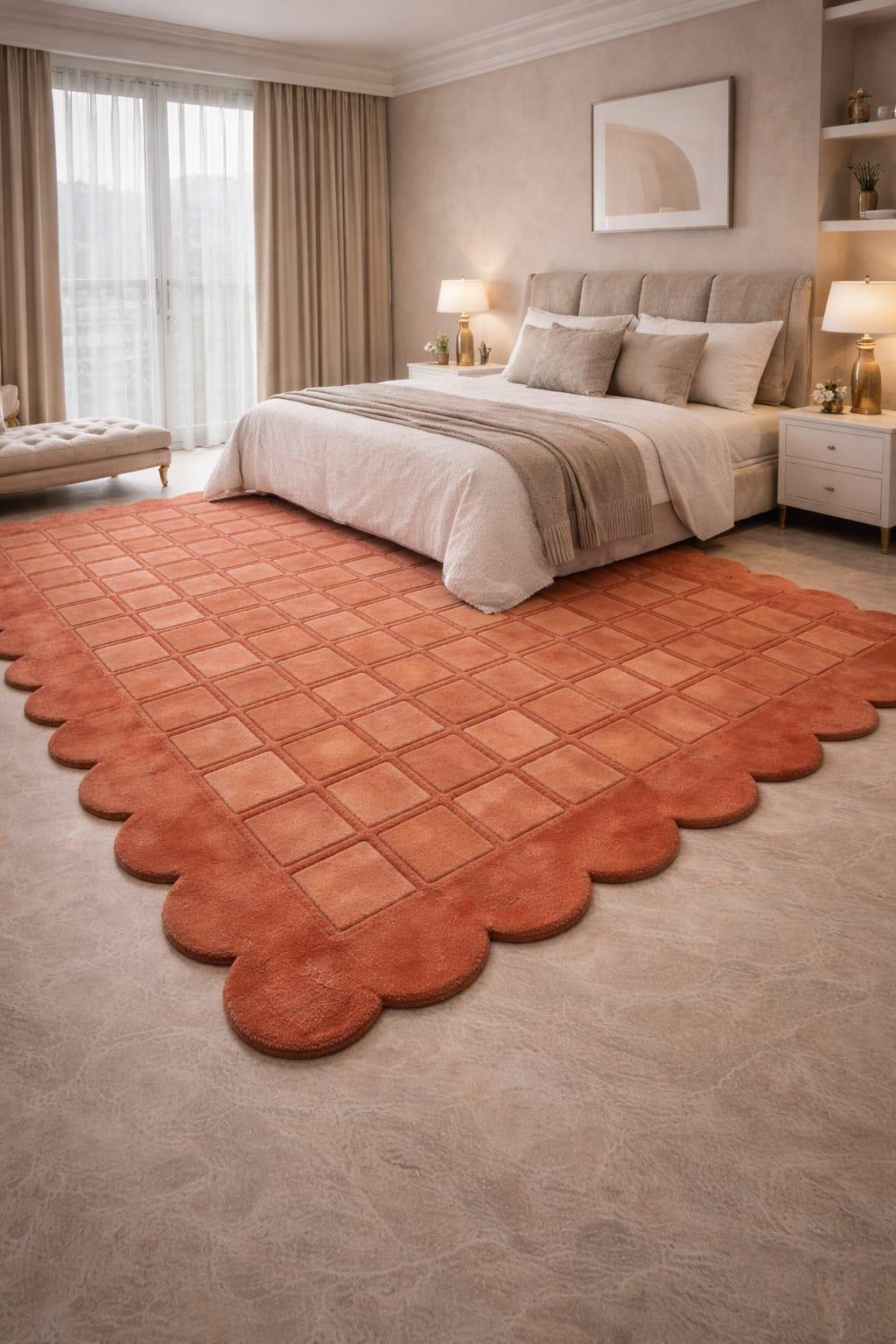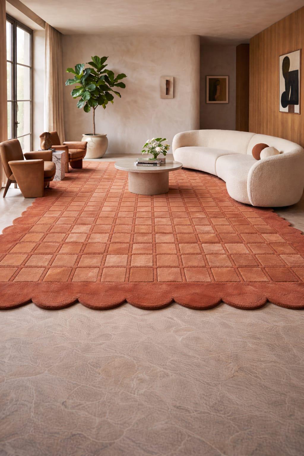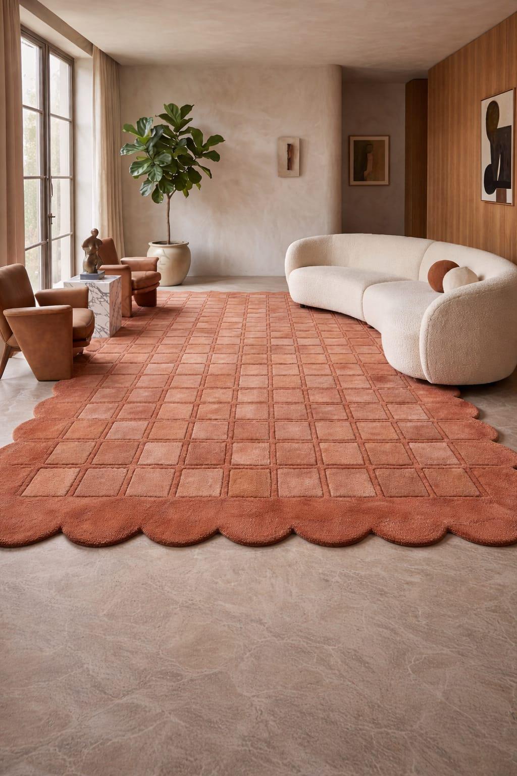 The rug features elegant scalloped edges that create a unique silhouette, giving your room a soft and sophisticated look. Its warm terracotta tone brings natural warmth and character to the space while complementing modern, minimalist, Scandinavian, and mid-century interiors.