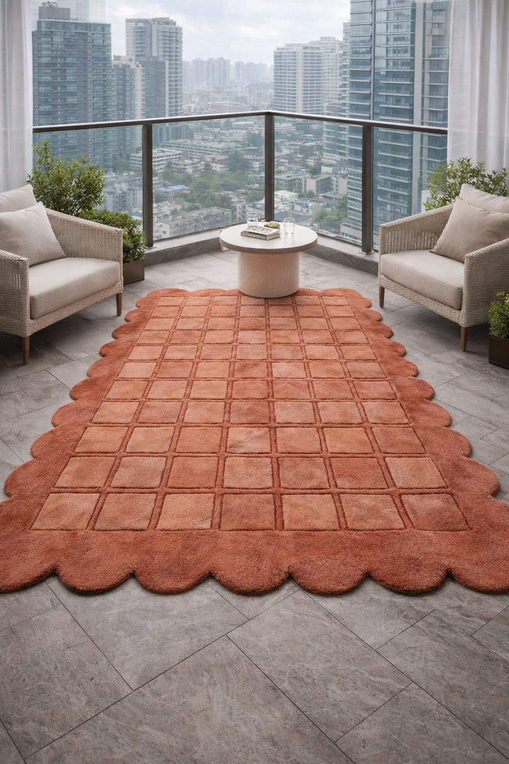 Add warmth, texture, and contemporary charm to your home with this Hand Tufted Scalloped Rug, designed with a beautiful terracotta checkered grid pattern. This modern area rug combines artistic design with everyday comfort, making it a stylish centerpiece for any interior space.