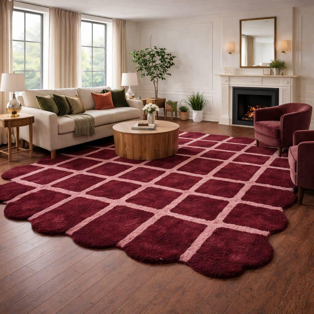 Add a bold and stylish touch to your home with this beautiful Scalloped Checkered Rug, designed to combine modern pattern with a unique decorative shape. Featuring a classic grid checkered design in rich burgundy red tones, this rug instantly becomes a standout piece that enhances the look of any living space.