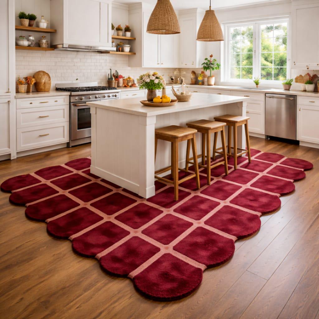 The distinctive scalloped edge shape gives this rug a soft and artistic appearance, making it different from traditional rectangular rugs. The modern grid pattern creates a clean and balanced look while the deep red color adds warmth, depth, and character to your interior décor.