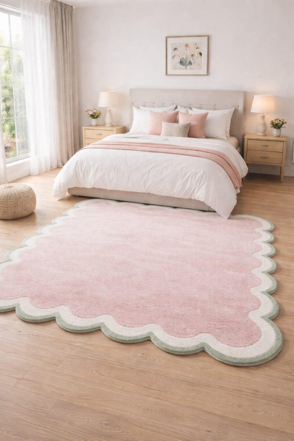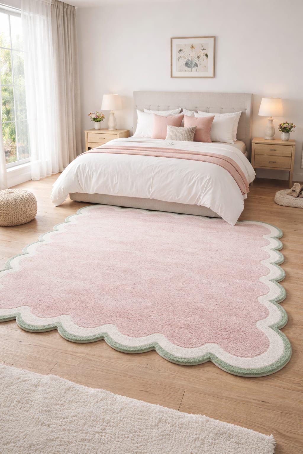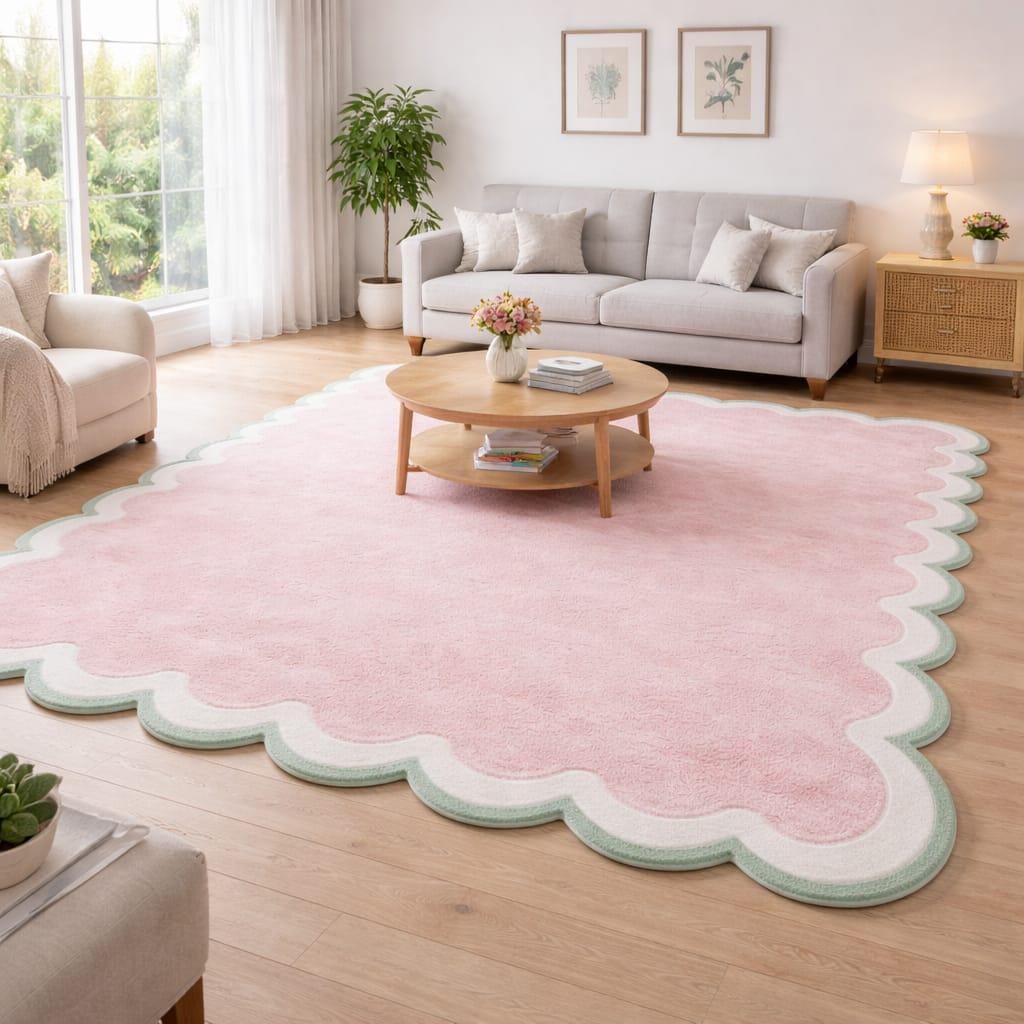The delicate scalloped edge design adds a playful yet sophisticated detail, making this rug perfect for modern, minimalist, and aesthetic interiors. Its soft pastel color blends beautifully with neutral furniture and light décor, creating a calm and cozy atmosphere in your space.