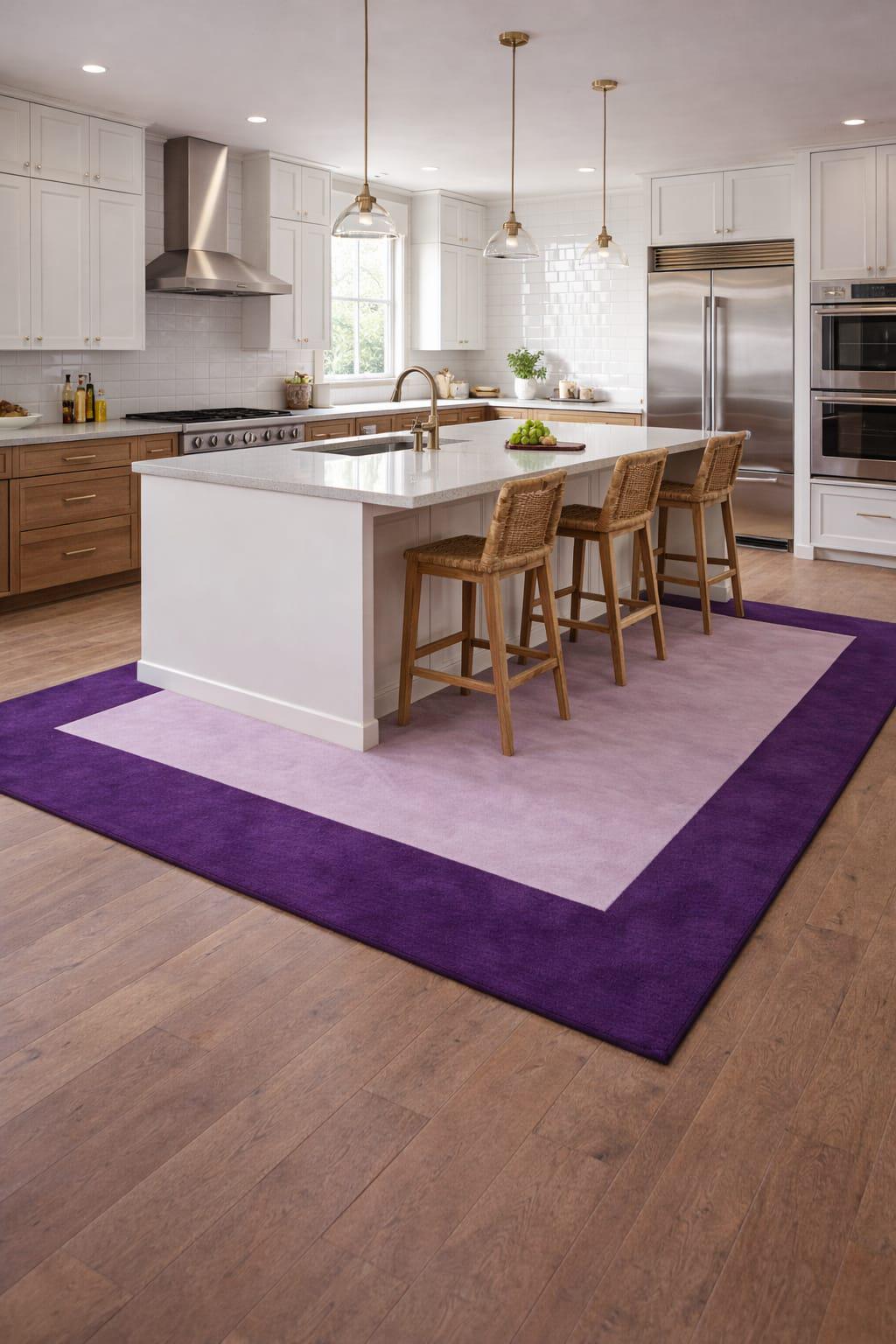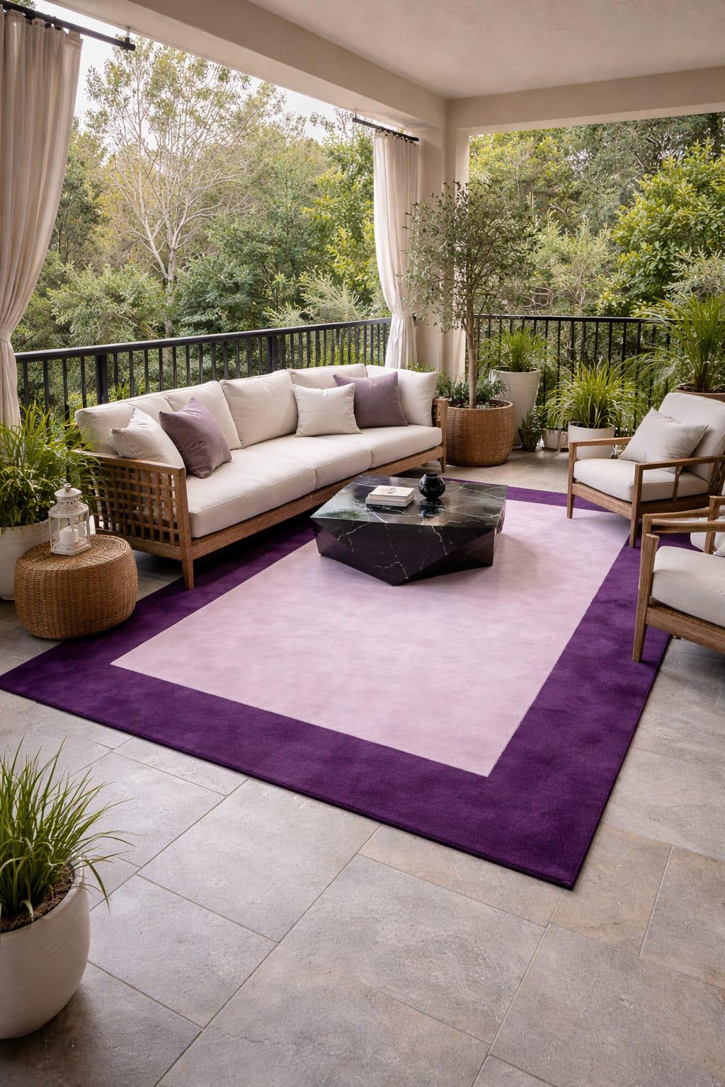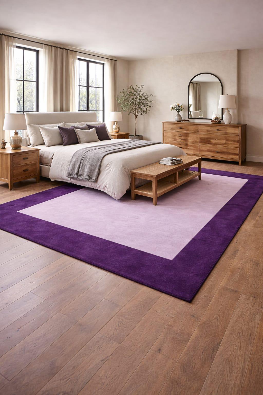 This minimalist border designer carpet is perfect for those who appreciate clean lines and sophisticated color combinations. The contrast between the light center and deep purple border adds depth and visual interest while maintaining a modern and elegant aesthetic. It pairs beautifully with neutral furniture, wooden floors, and modern décor elements.