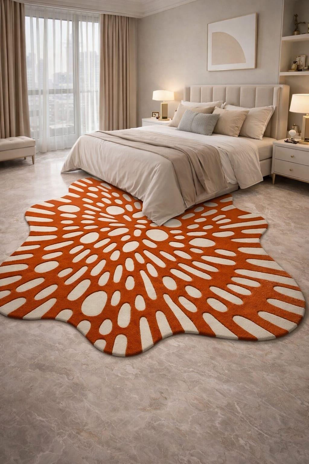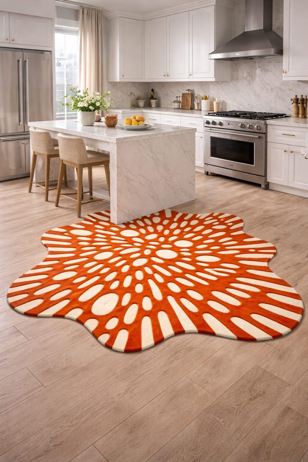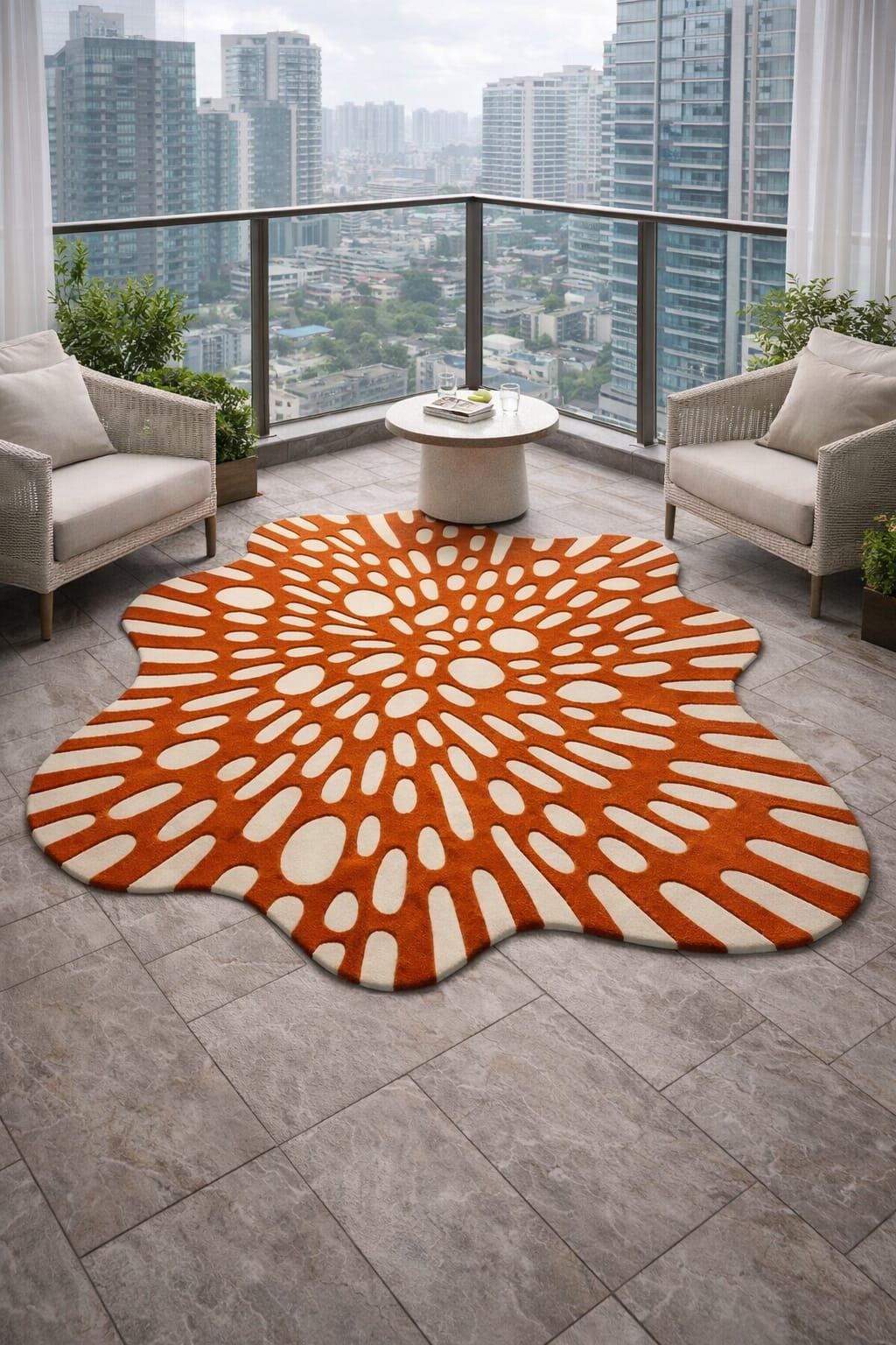Make a bold artistic statement in your home with this stunning Modern Abstract Area Rug, designed with a unique organic sunburst shape that instantly becomes the focal point of any room. The vibrant orange pattern combined with a soft neutral background creates a beautiful balance of warmth and modern elegance, perfect for contemporary interiors.
