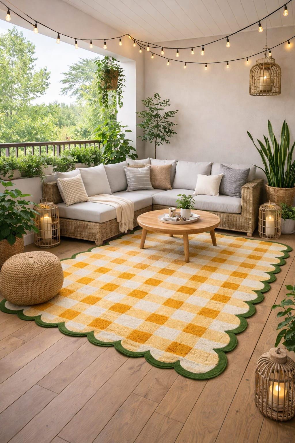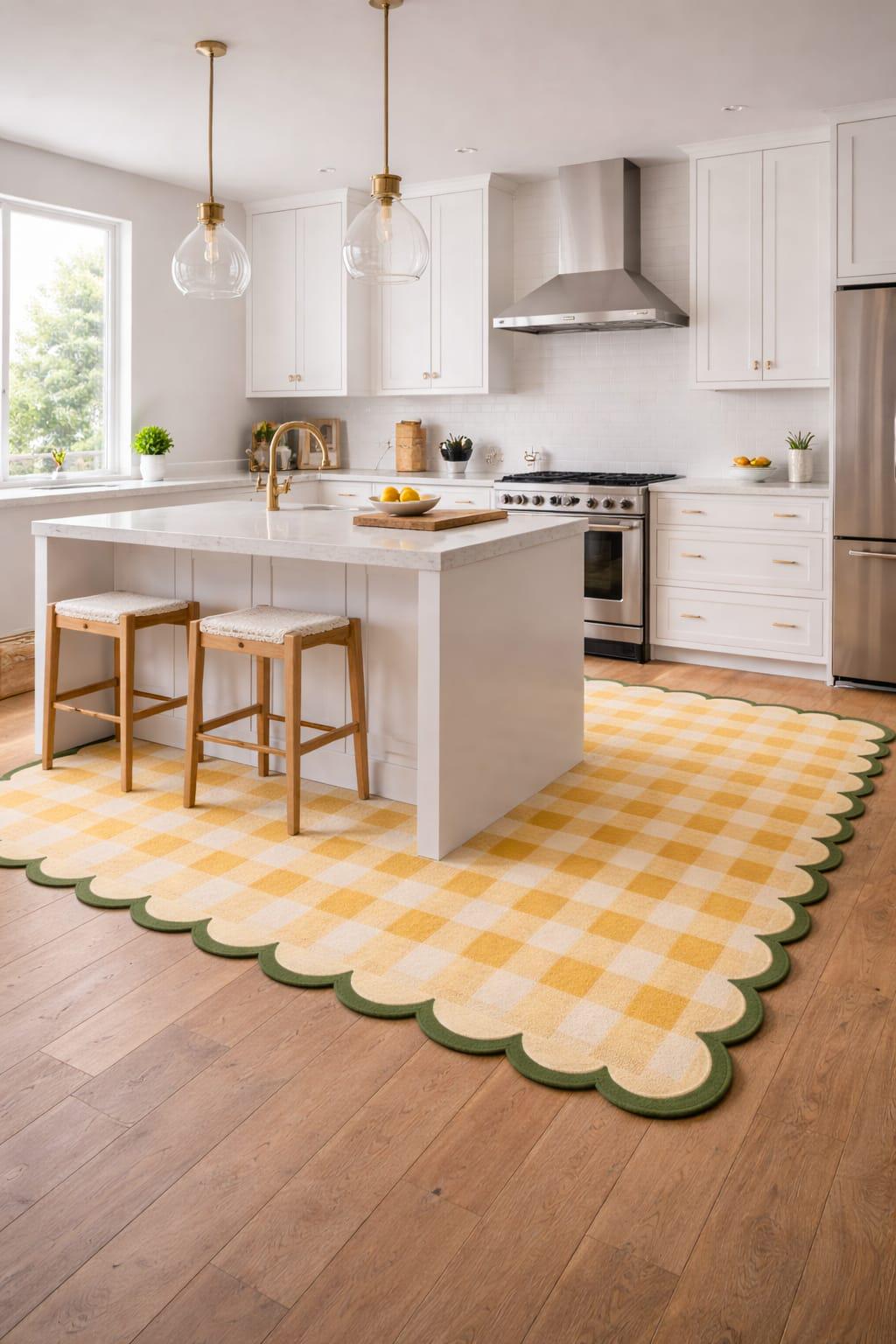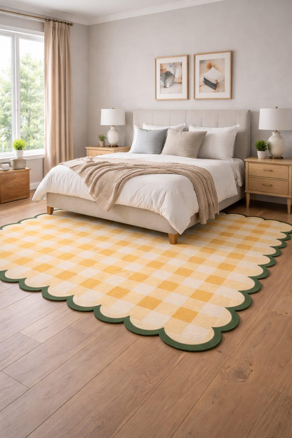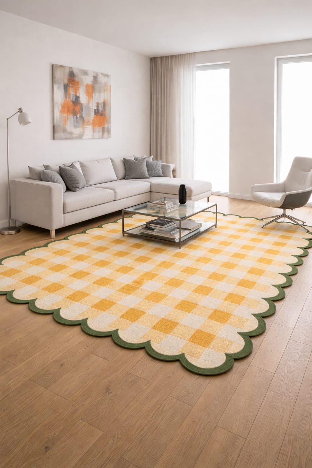 modern handmade tufted rug featuring a soft checkered pattern and beautiful scalloped edges. Designed with a calming blend of yellow, cream, and green tones, this rug brings warmth and elegance to any living space. The playful yet minimal design makes it a perfect choice for modern homes, cozy bedrooms, stylish living rooms, kids’ rooms, and even creative studio spaces.