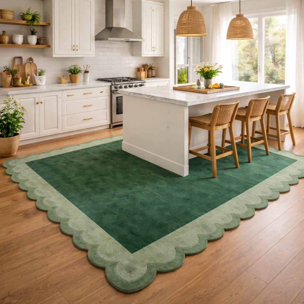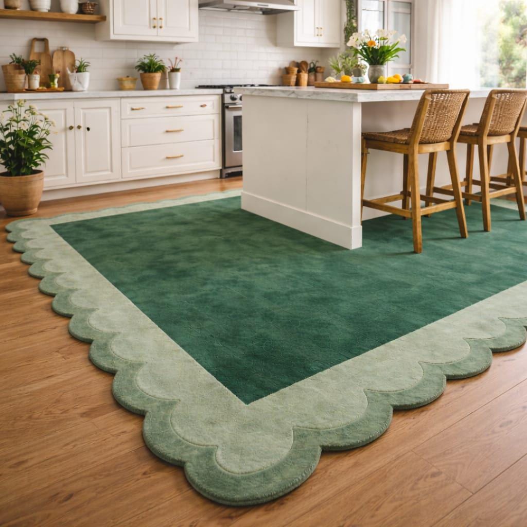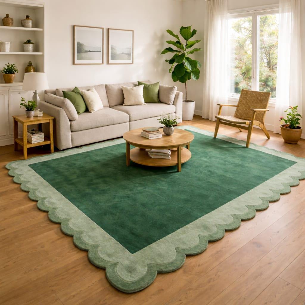 Bring calm, nature-inspired elegance into your home with this modern handmade green tufted rug featuring a soft scalloped edge design. The rich green center paired with a lighter green decorative border creates a soothing, balanced look that fits beautifully in contemporary, minimal, and boho-style interiors. This rug is perfect for living rooms, bedrooms, reading corners, nursery rooms, or cozy lounges where comfort and style matter.