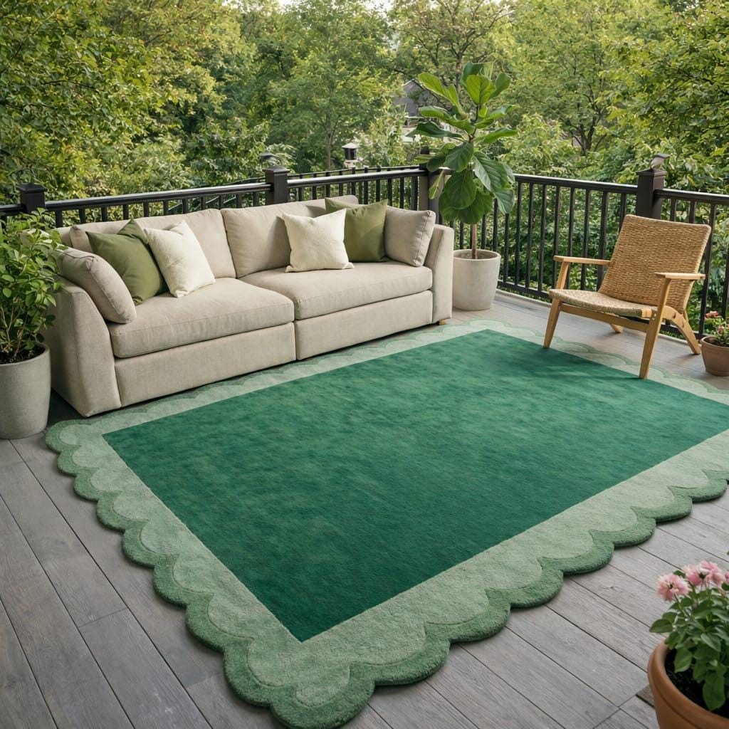 Handmade Green Scalloped Edge Tufted Rug, Modern Minimalist Area Rug