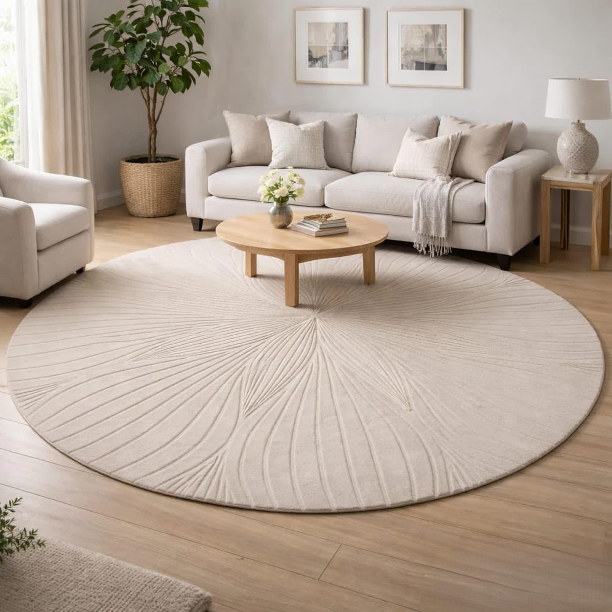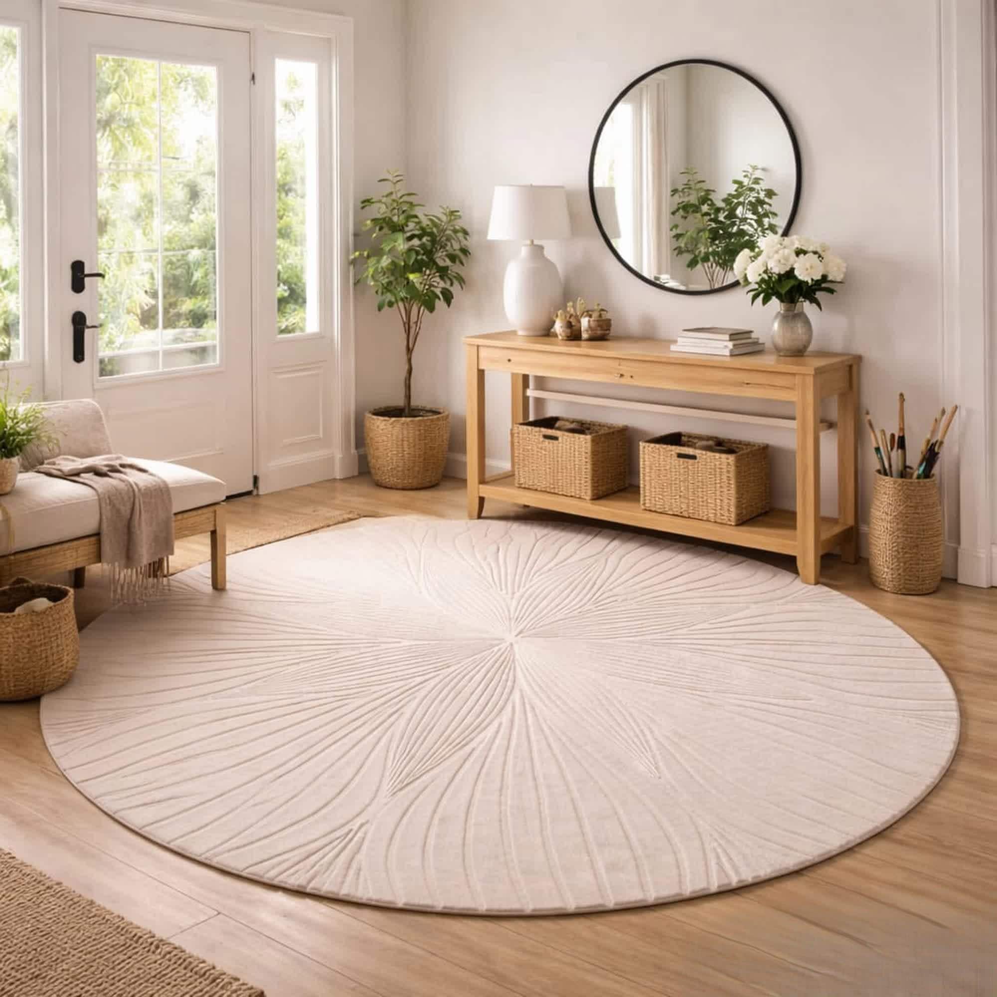 The circular design works beautifully as a statement rug, helping define seating areas or adding softness to hardwood floors. The textured pattern gives the rug depth and character while keeping the look elegant and timeless.