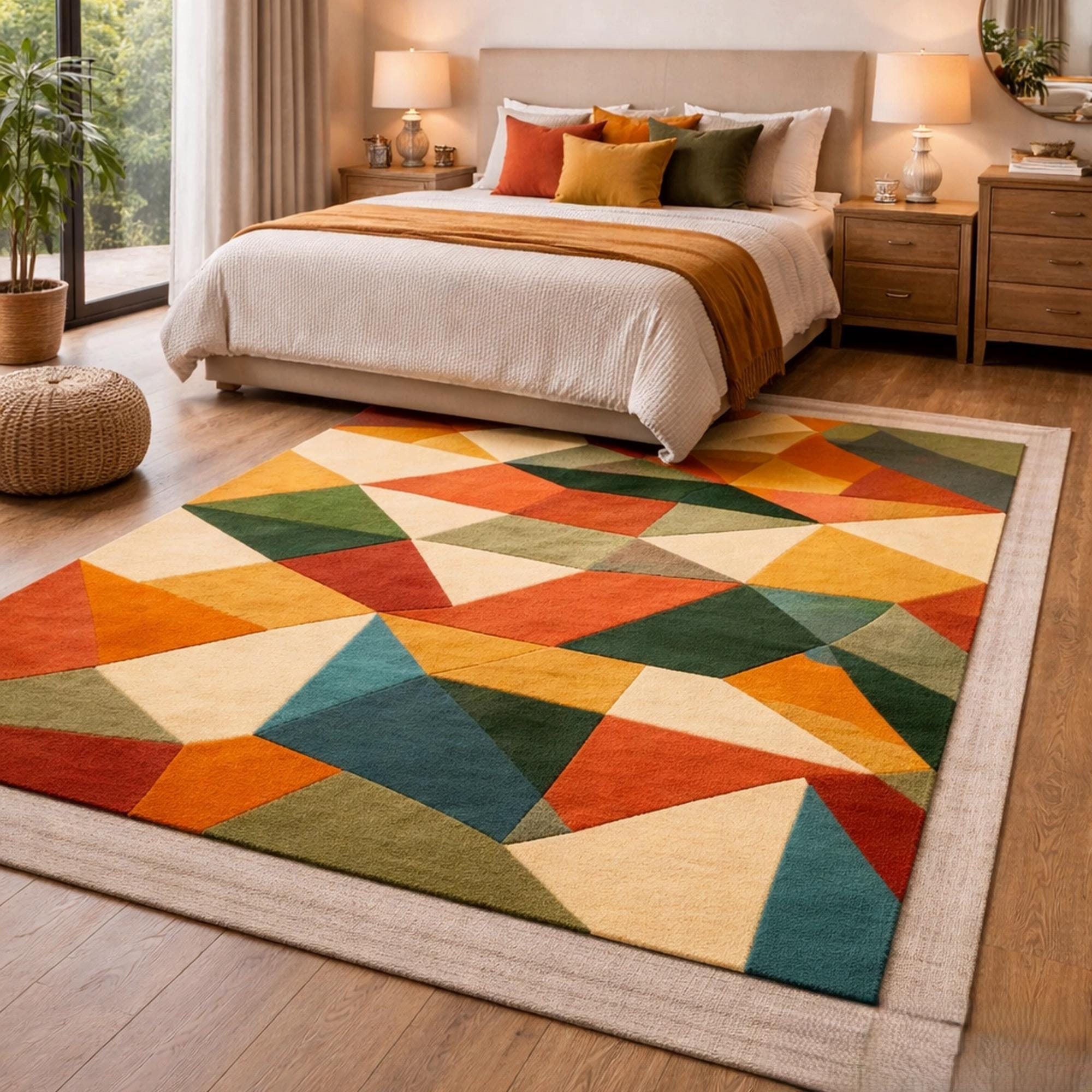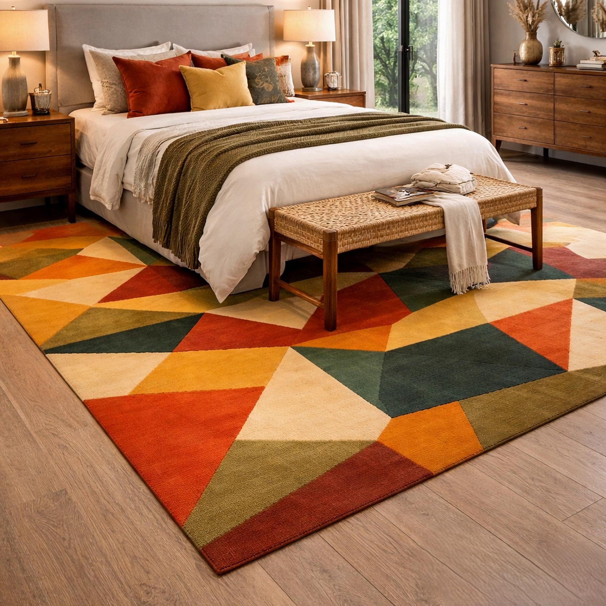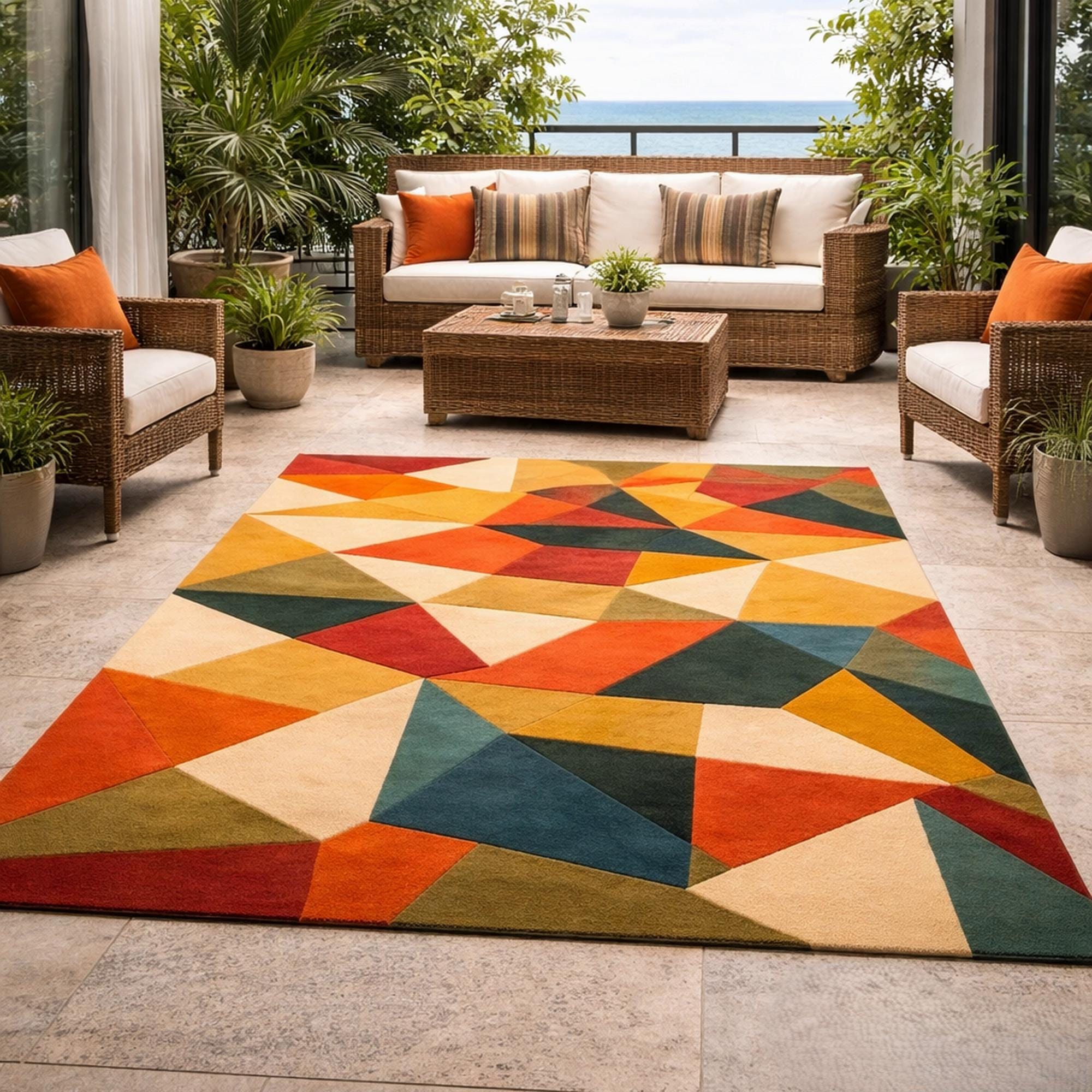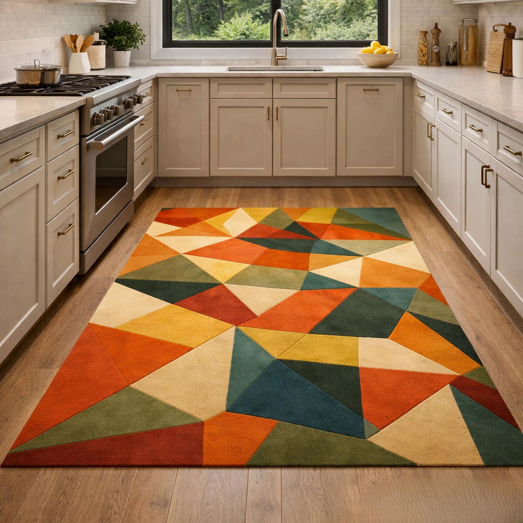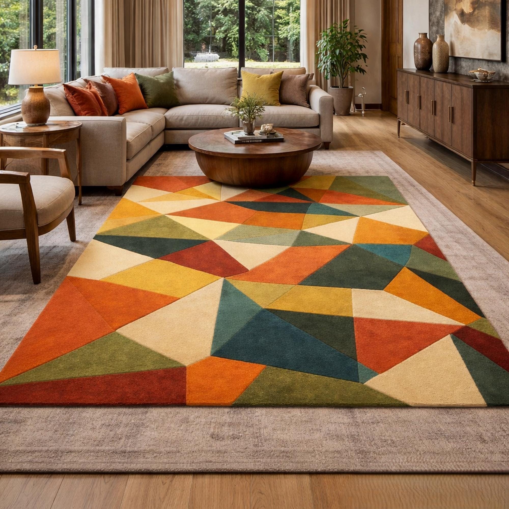 Elevate your space with this stunning abstract geometric rug, designed to bring color, style, and personality into your home. Featuring a vibrant mix of shapes and tones, this colorful area rug blends modern artistry with everyday comfort. The unique triangle pattern rug design creates a bold visual impact, making it a perfect artistic statement rug for any contemporary interior.