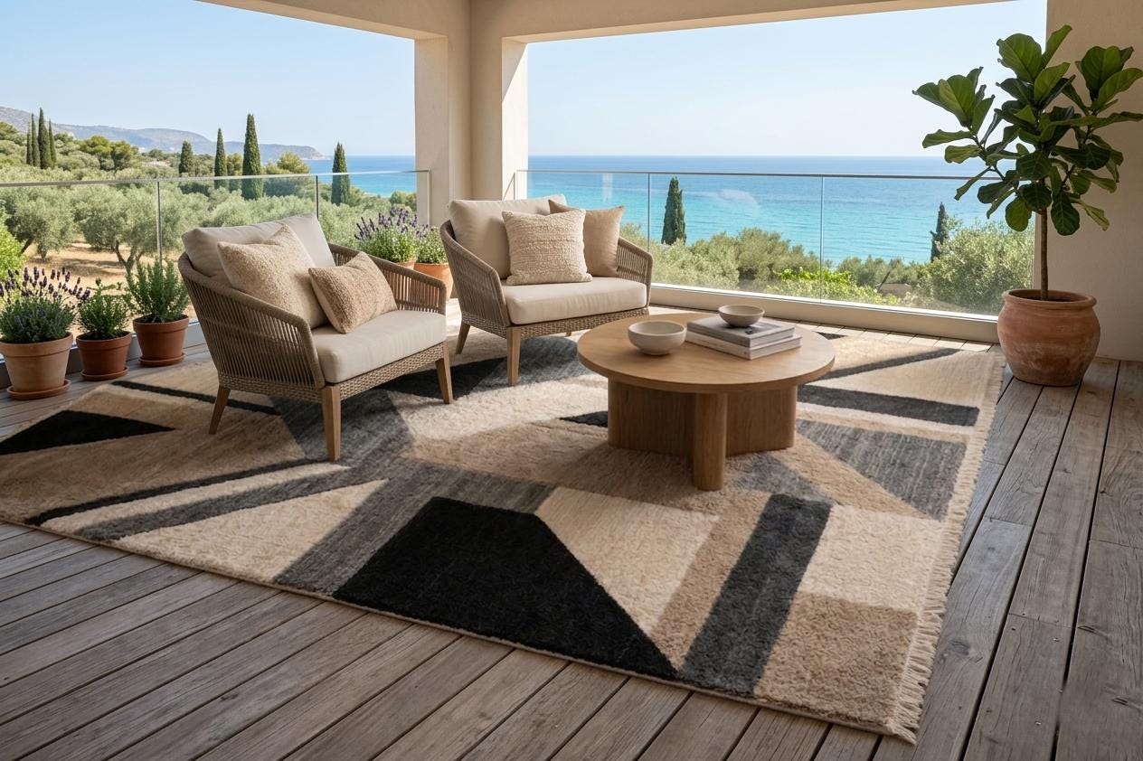 Hand-Tufted Geometric High-Pile Wool Area Rug in Black & Beige - Abstract Modern Fringed Rug for living room